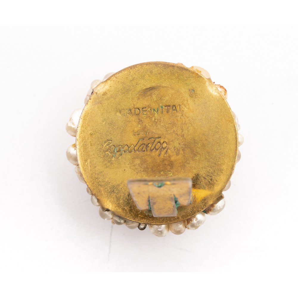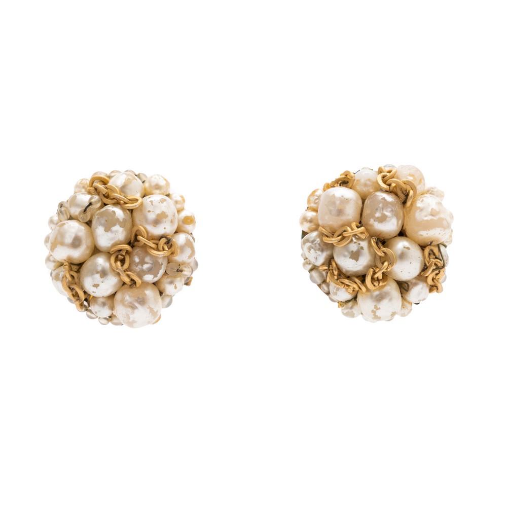 Orecchini a bottone in metallo dorato con perle barocche e catenelle. Marchio di produzione incusso.