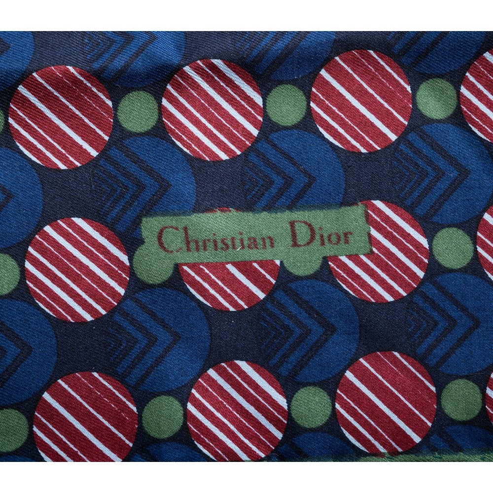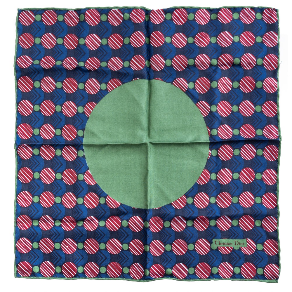 Foulard in seta fondo blu con fantasia geometrica in verde, rosso e bianco. Marchio di produzione.