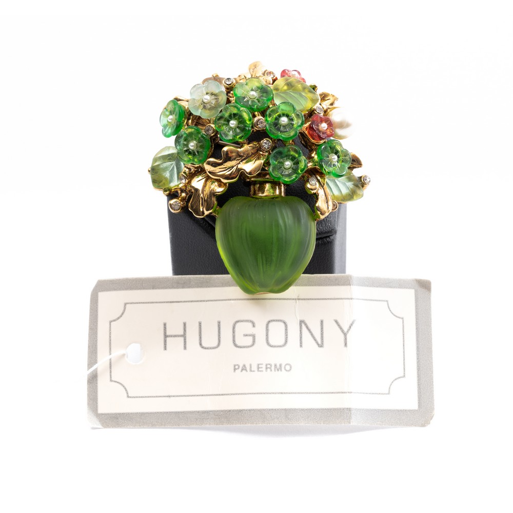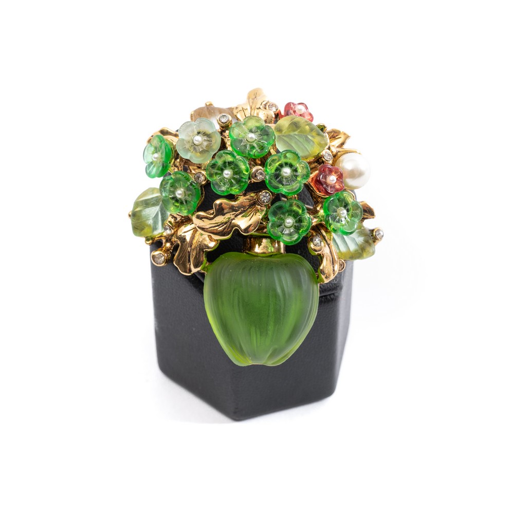 Spilla a vaso di fiori in metallo dorato con vetri satinati e lucidi verdi e rossi, perline. Etichetta di produzione.