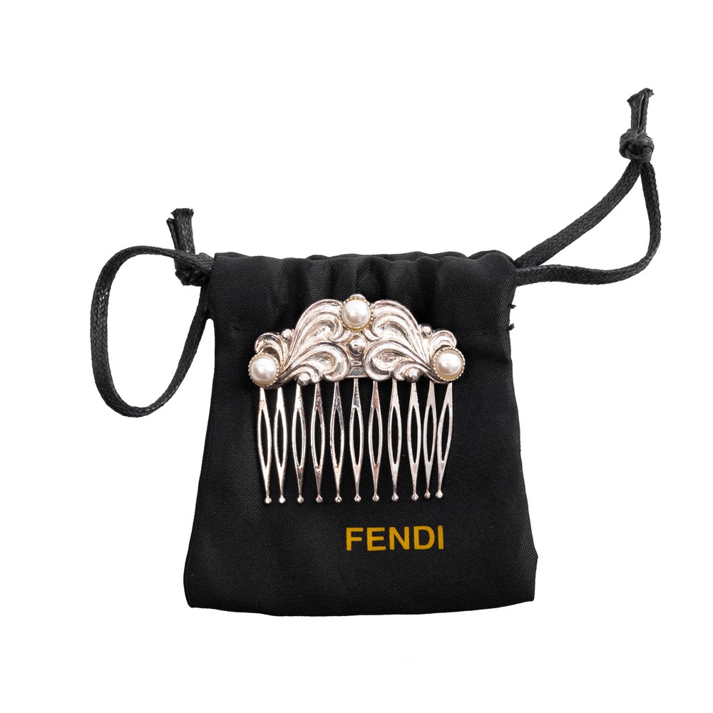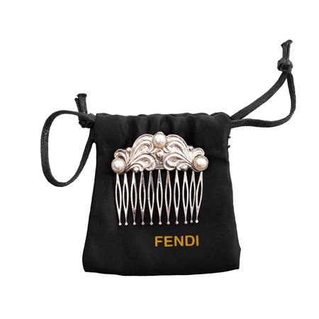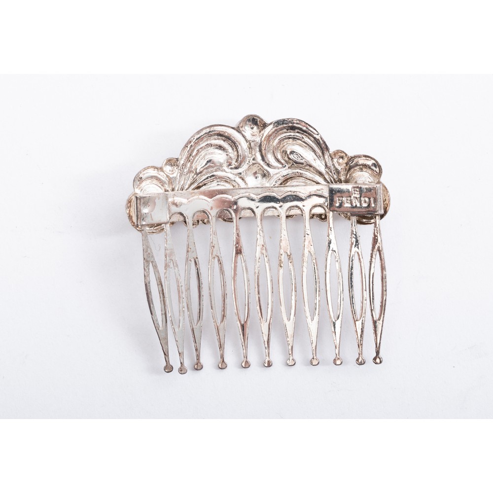 Pettine in metallo con tre perle cabochon. Marchio di produzione.