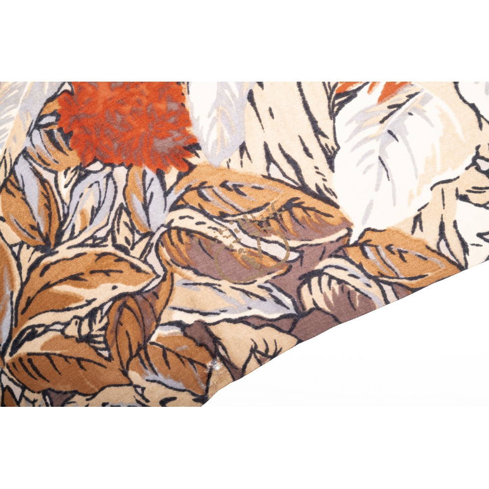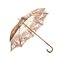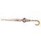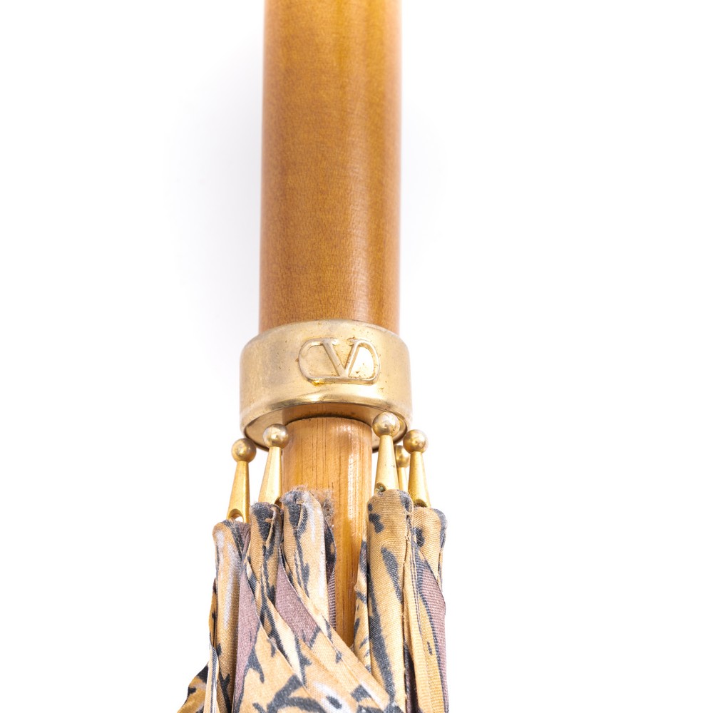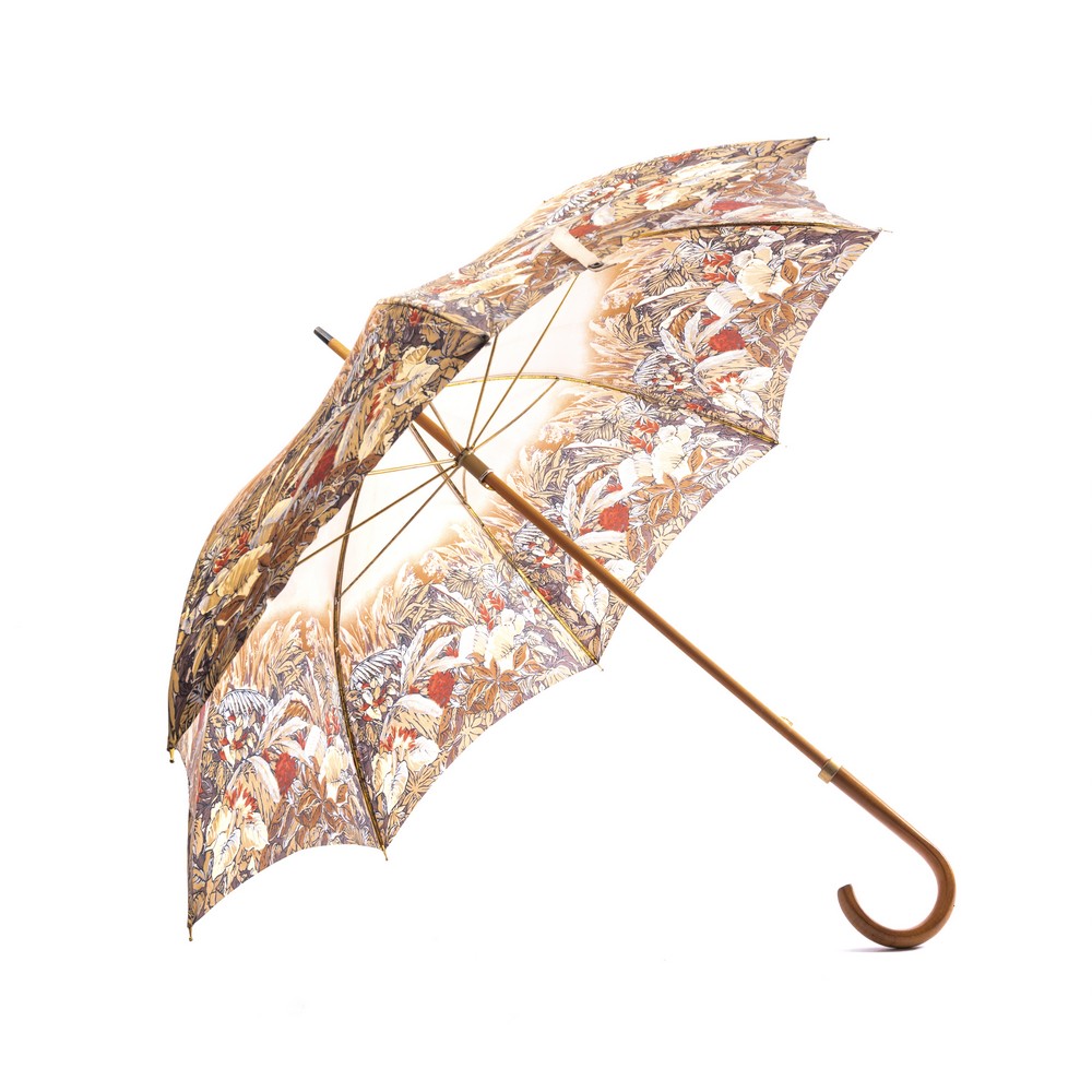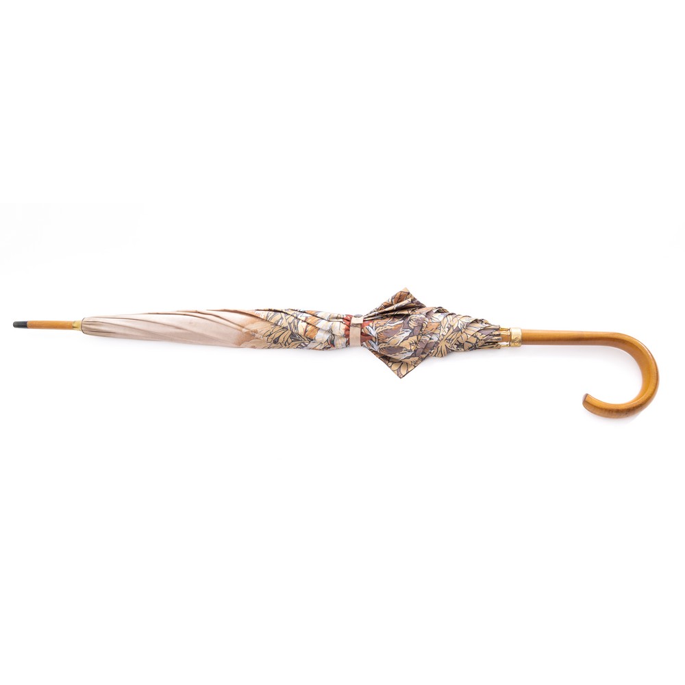 Ombrello con disegno a foglie su fondo beige, manico in legno. Firma sulla stampa.