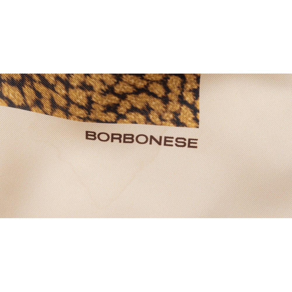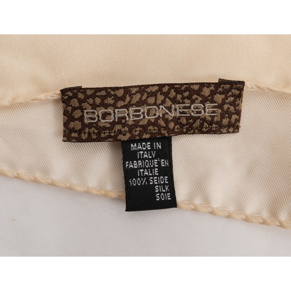 Foulard in pura seta color beige e marrone con stampa Borbonese. Macchie. Marchio di produzione.