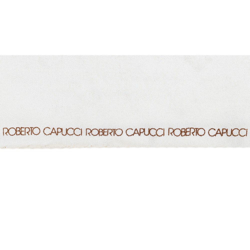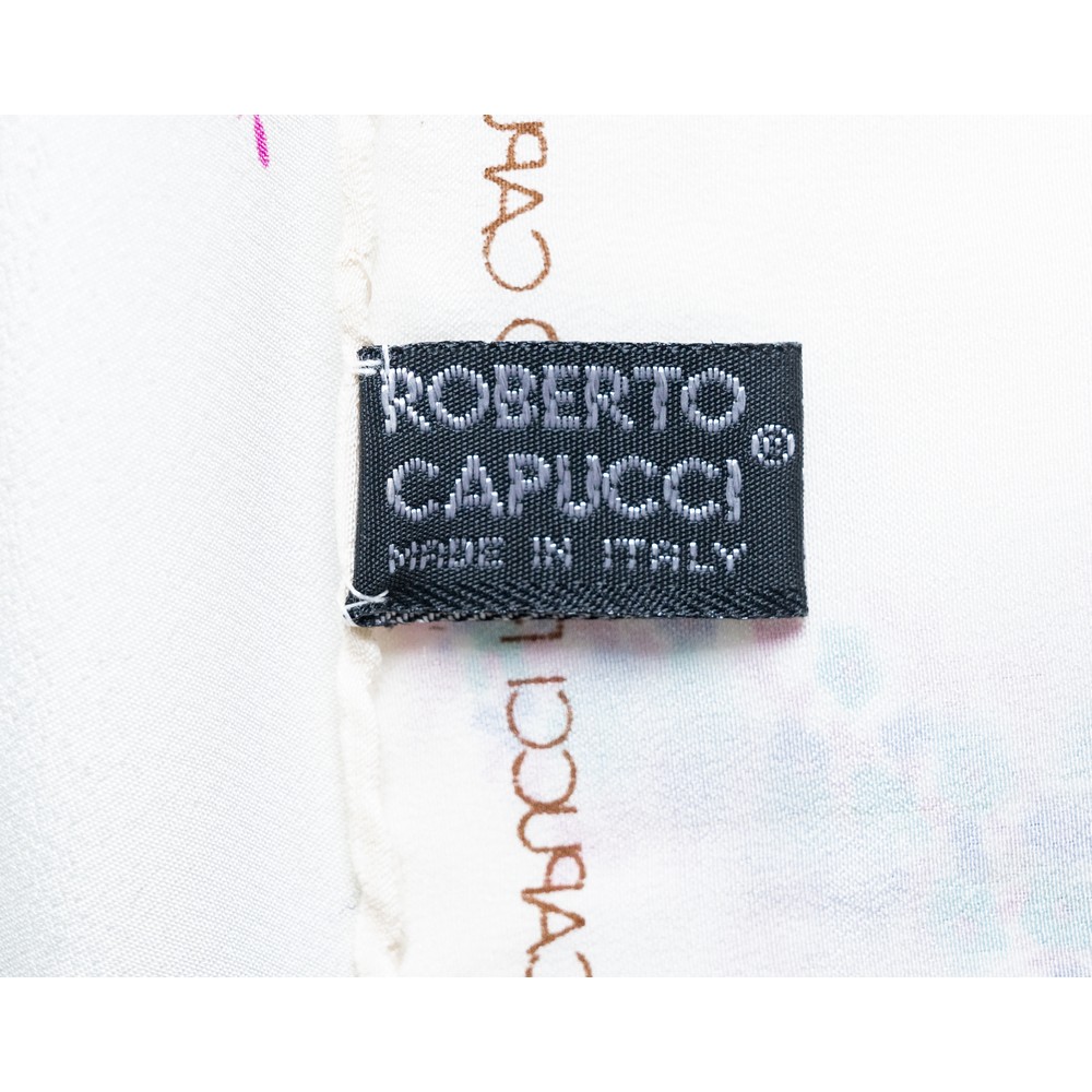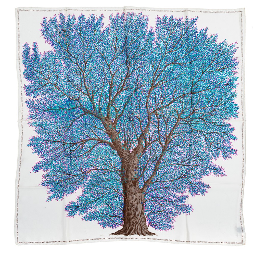 Foulard in pura seta decorato con albero centrale, fondo bianco e foglie azzurre e rosa. Etichetta di produzione. Dimensioni:80x80 cm.