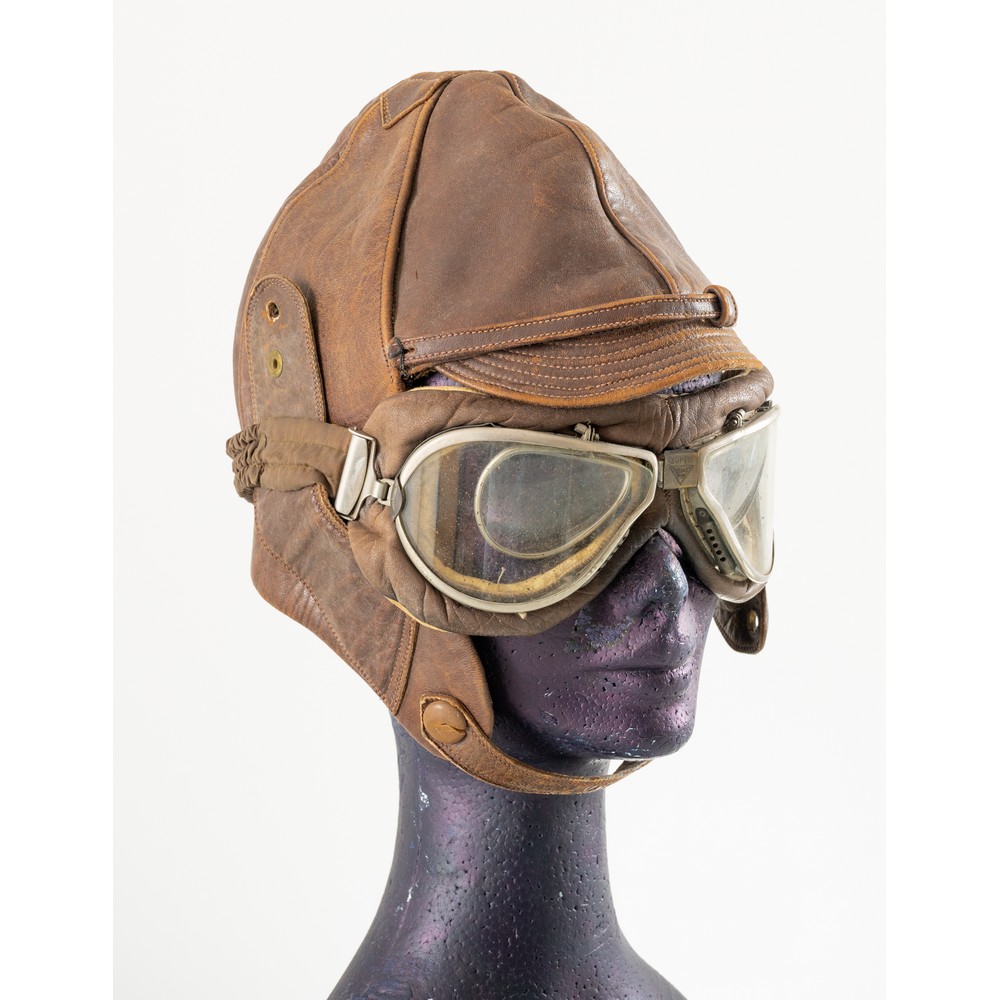 Cuffia da pilota in pelle marrone chiusa sotto il mento con fibbia a bottoni, piccola visiera sulla fronte, un paio di occhiali in pelle con lenti Ratti.