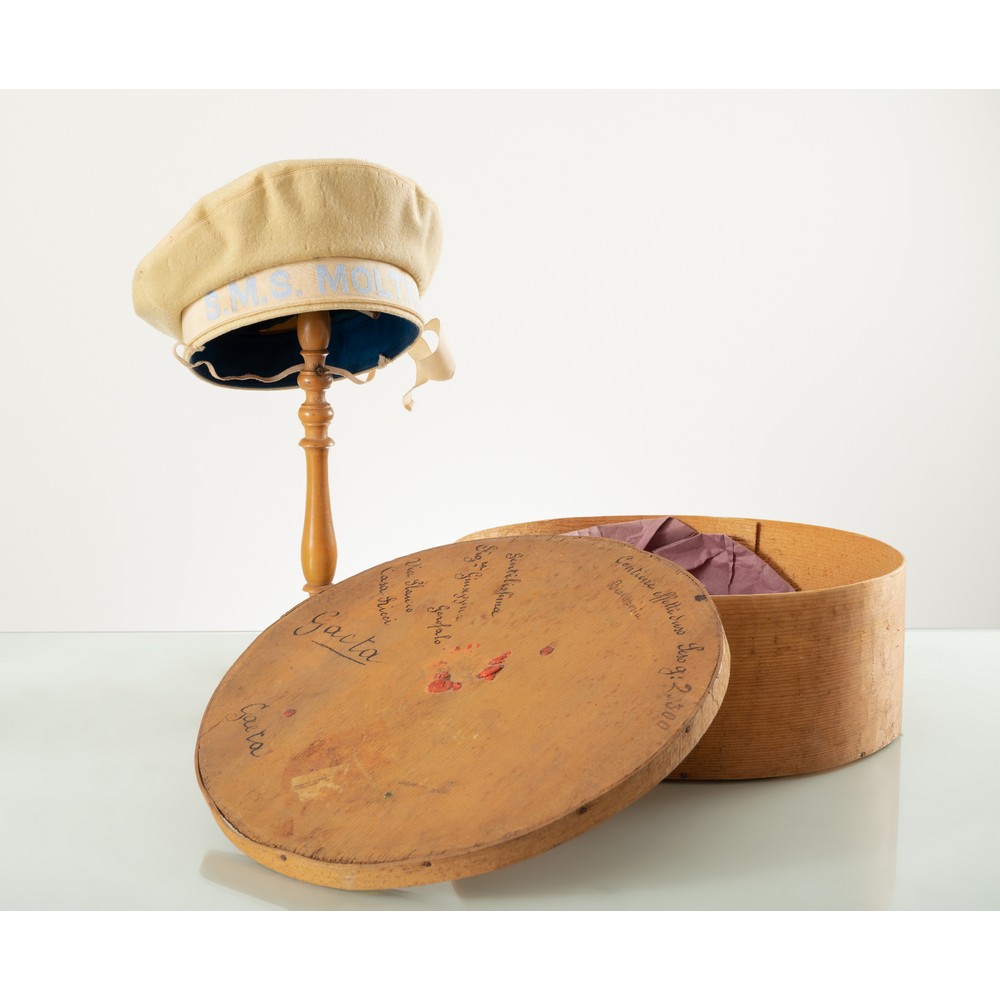 Cappello militare S.M.S ("Nave di Sua Maestà Moltke") in panno panna, cappelliera in legno.