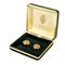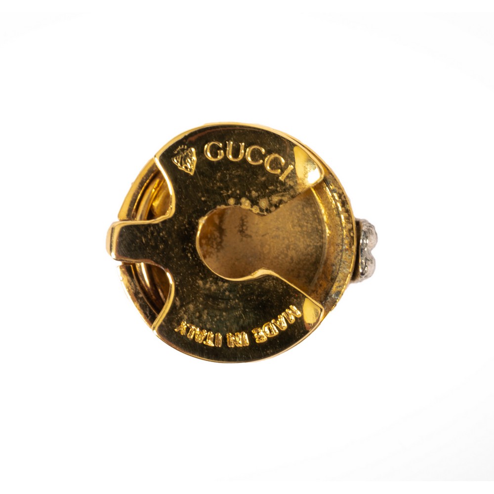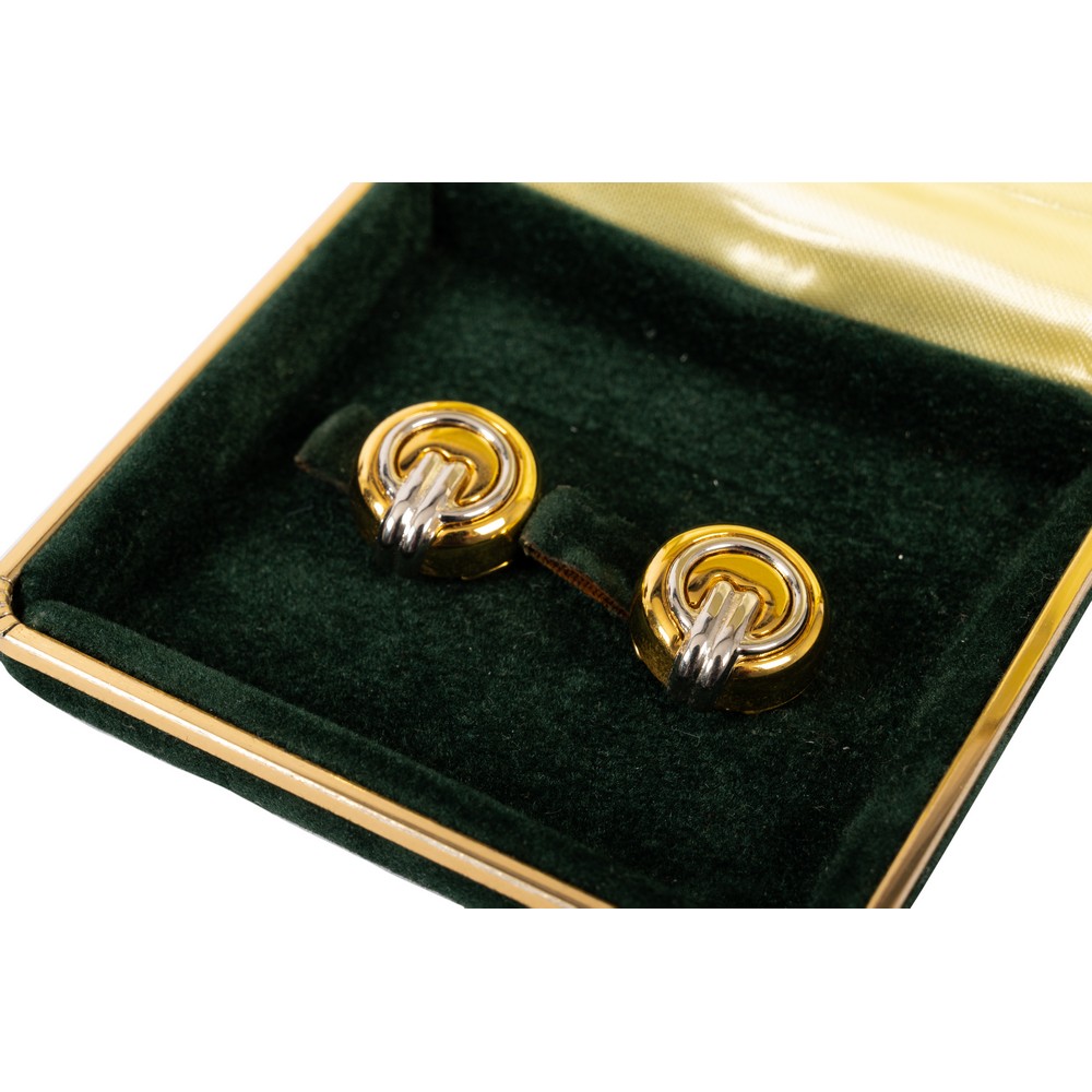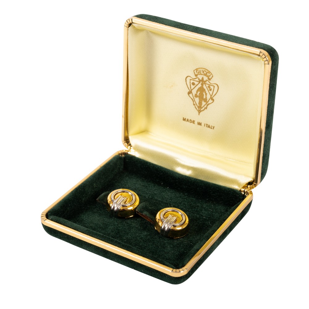 Copribottoni rotondi in metallo dorato ed argentato logo “G”, scatolo originale. Marchio di produzione.