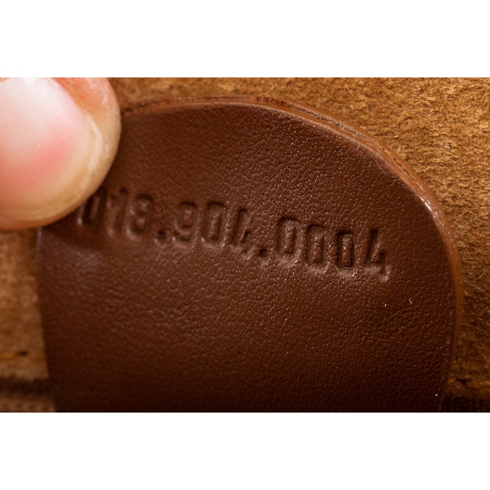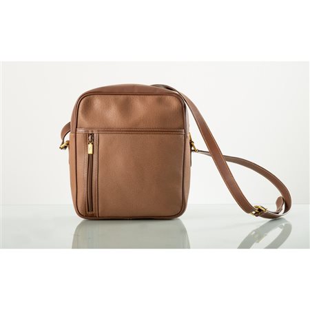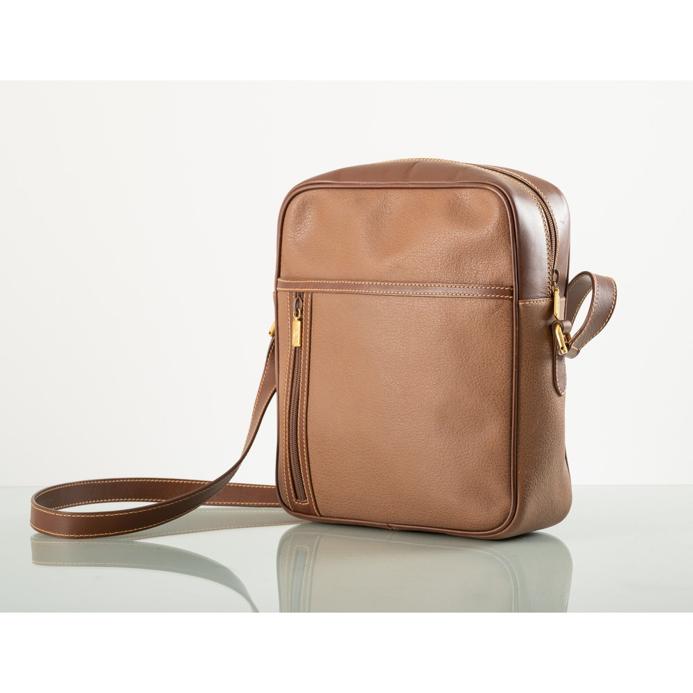 Borsello in pelle d marrone con tasca e cerniera frontale, logo dorato. Internamente marchio di produzione e numerazione 018/904/0004. Misura 24x10x30 cm.
