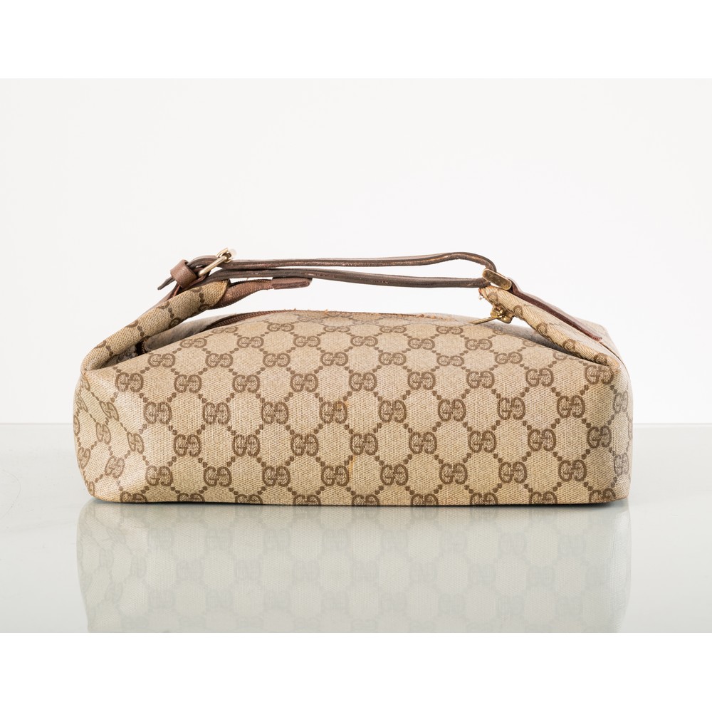 Beauty case in tela supreme monogram beige e marrone, minuterie dorate, cinghia in pelle marrone. Marchio di produzione. Misura 30x10x20 cm.