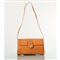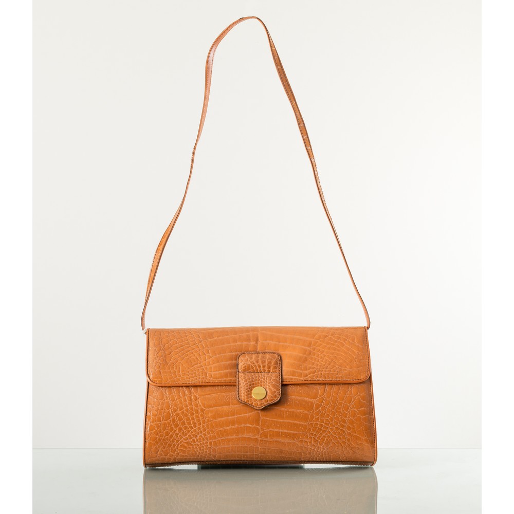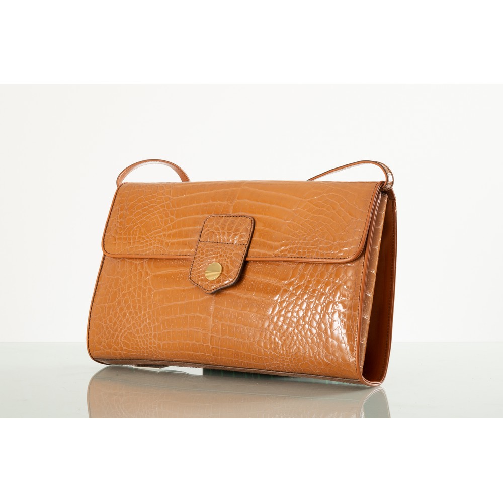 Borsa a tracolla in pelle color cognac con chiusura a bottone dorato. Misura 33x07x20 cm.