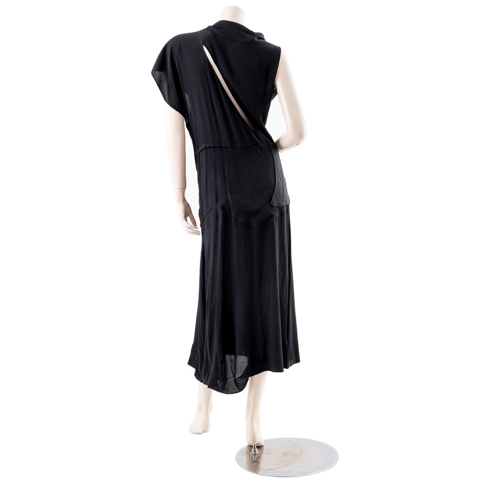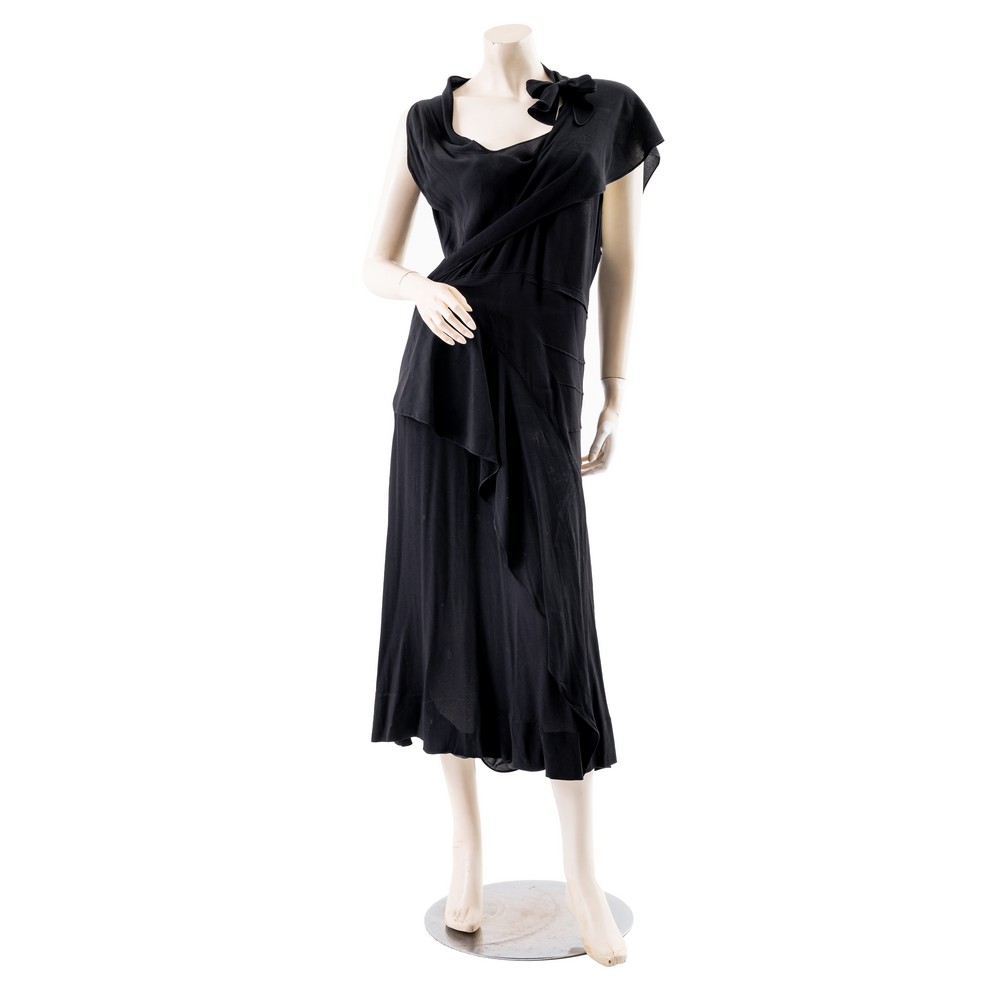 Abito da cocktail in crepe nero, tagli diagonali, scollo morbido con chiusura a fiocco, taglio in trasparenza sulla schiena. Taglia sartoriale.