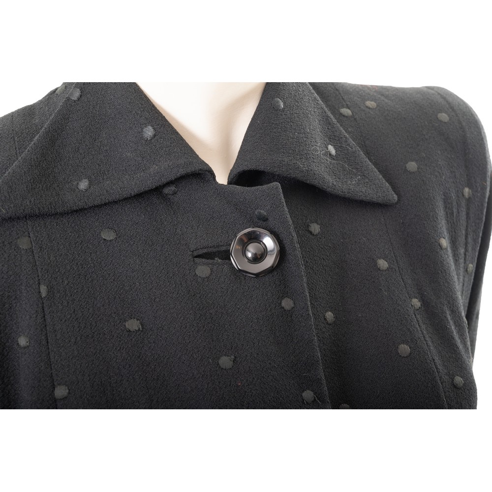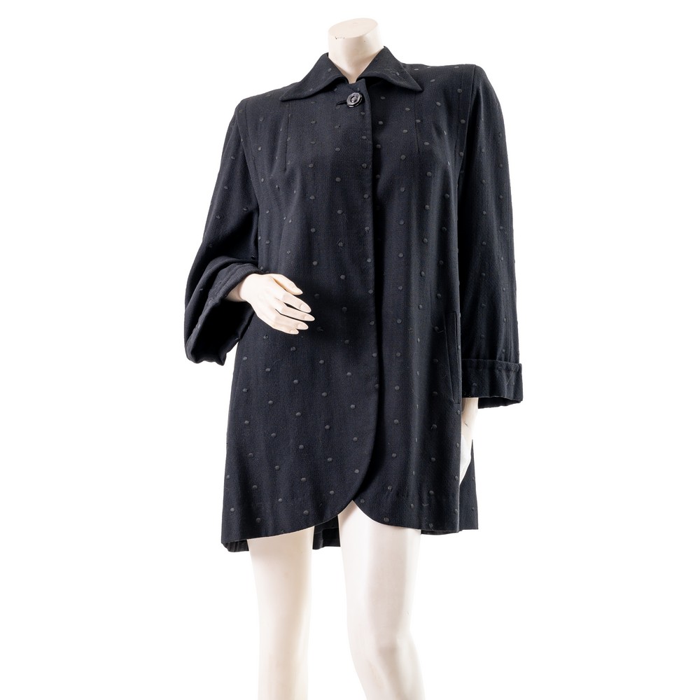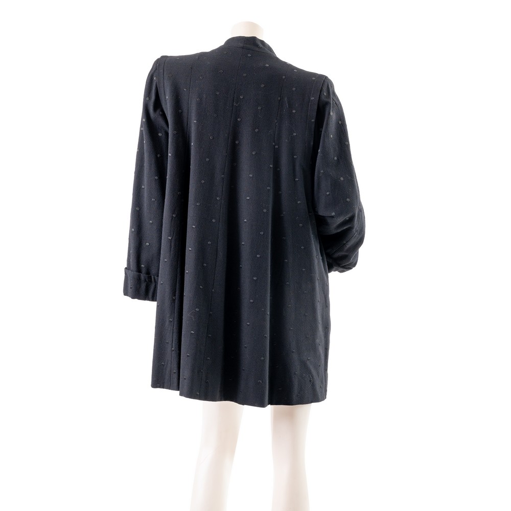Soprabito in tessuto nero a pois, ampia manica, chiusura con grande bottone sul collo. Lievi macchie. Taglia sartoriale.