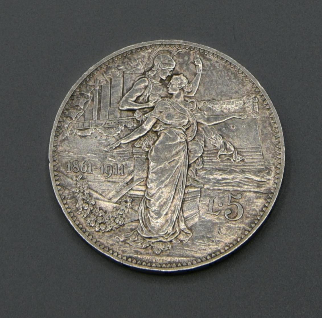 Verso: rappresentazione allegorica dell'Italia presso il monumento simboleggiante la città di Roma. Sullo sfondo una nave da guerra a vapore, a prua festoni e scudo sabaudo. A sinistra un aratro ornato con una ghirlanda di fiori a cui sono sovrapposte le date 1861-1911. A destra l'indicazione del valore e sotto l'iniziale del luogo in cui fu coniata, Roma