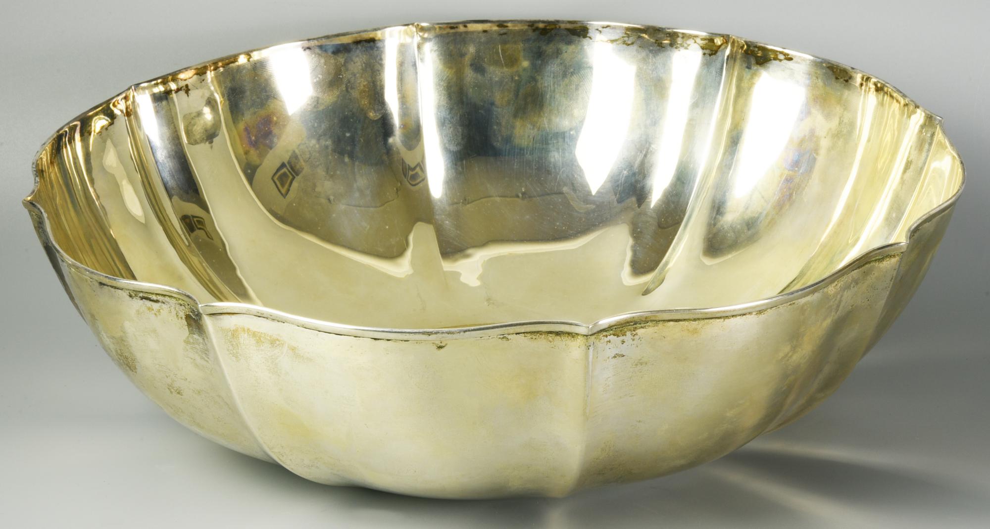 contenitore circolare a profilo sagomato, vasca bombata, rastremata verso l'alto con pareti baccellate; lavorato a sbalzo; realizzato in argento a titolo 800/1000