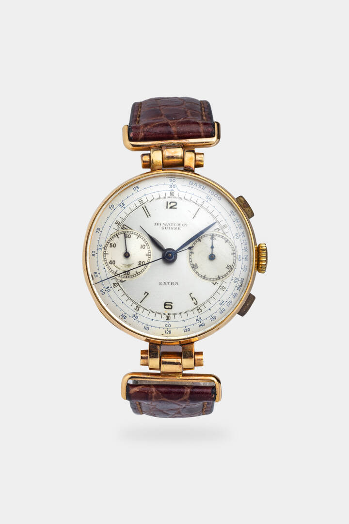 Cassa in oro rosa con fondello a pressione e anse basculanti. Quadrante argento con indici serigrafati, indicazione dei secondi continui al 9 e dei 45 minuti al 3.