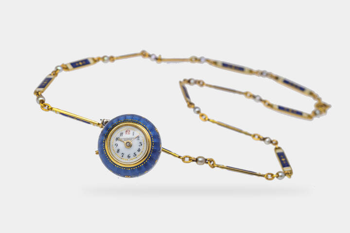 Cassa in oro, di forma sferica, interamente smaltata. Quadrante bianco con numeri Breguet.