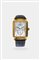 Cassa di forma, in oro, con fondello a vista. Quadrante bianco con indici geometrici applicati e subcontatori con sfondo effetto madreperla indicanti al 3 la riserva di carica, al 6 la data ed al 9 l'indicazione dei secondi continui.
