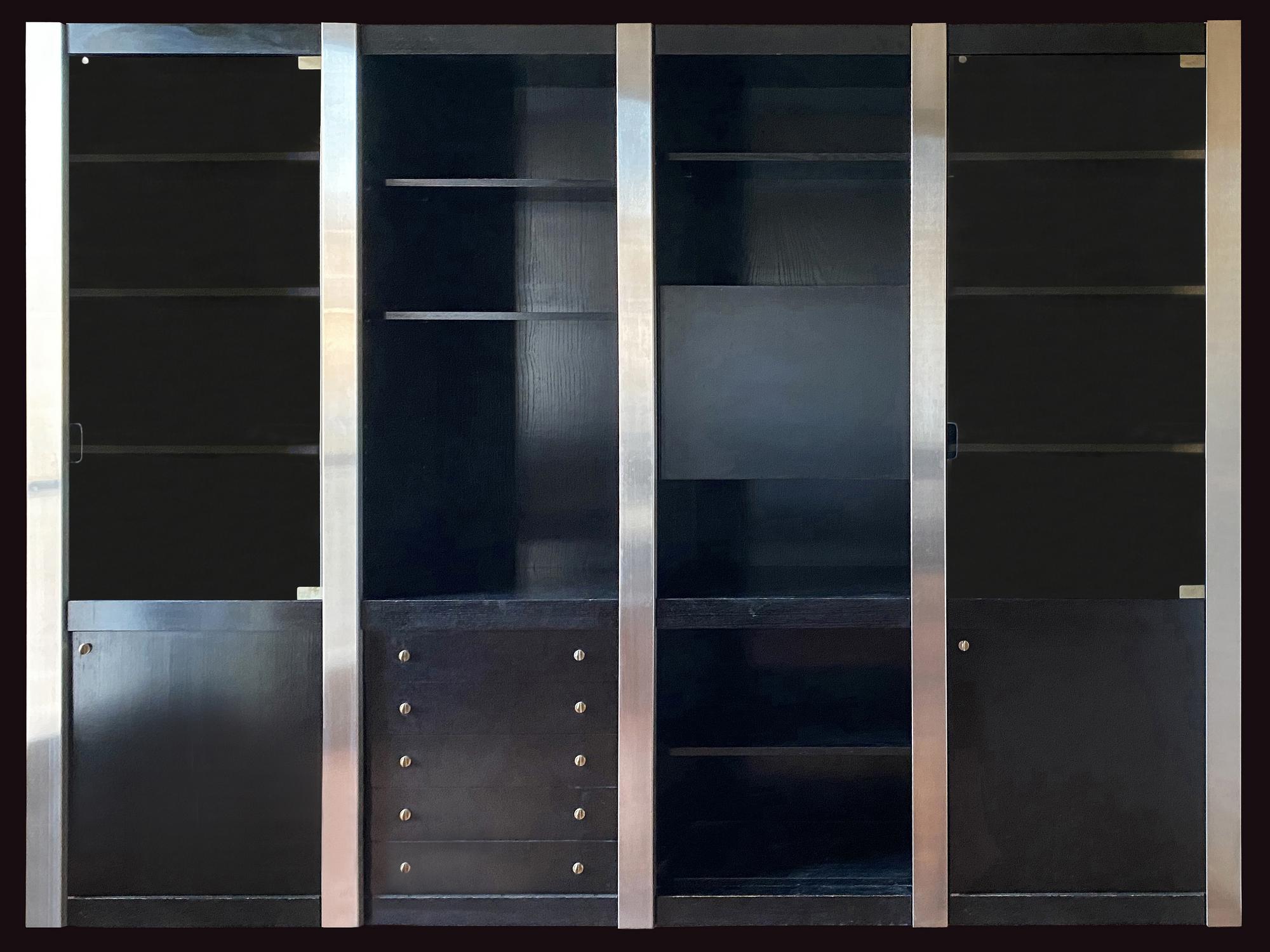 struttura in legno laccato nero, vetri fume' e metallo satinato