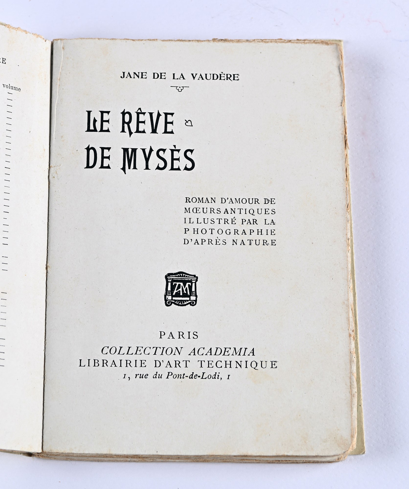 De la Vaudère, Jane - LE RÊVE DE MYSÈS 1 vol. Bross. ed. pp. 128 + tavv. ill., mm 150x110. Collection academica. Volume illustrato, di difficile reperibilità. Jeanne Scrive (1857-1908) è il vero nome della scrittrice francese che si nasconde dietro lo pseudonimo di Jane de la Vaudère: fu autrice prolifica e partecipe dei sentimenti del Decadentismo e del Naturalismo, collaborò inoltre con il Teatro del Grand Guignol. Testo a stampa s.d., Paris, Libr. d’art technique mm 150x110