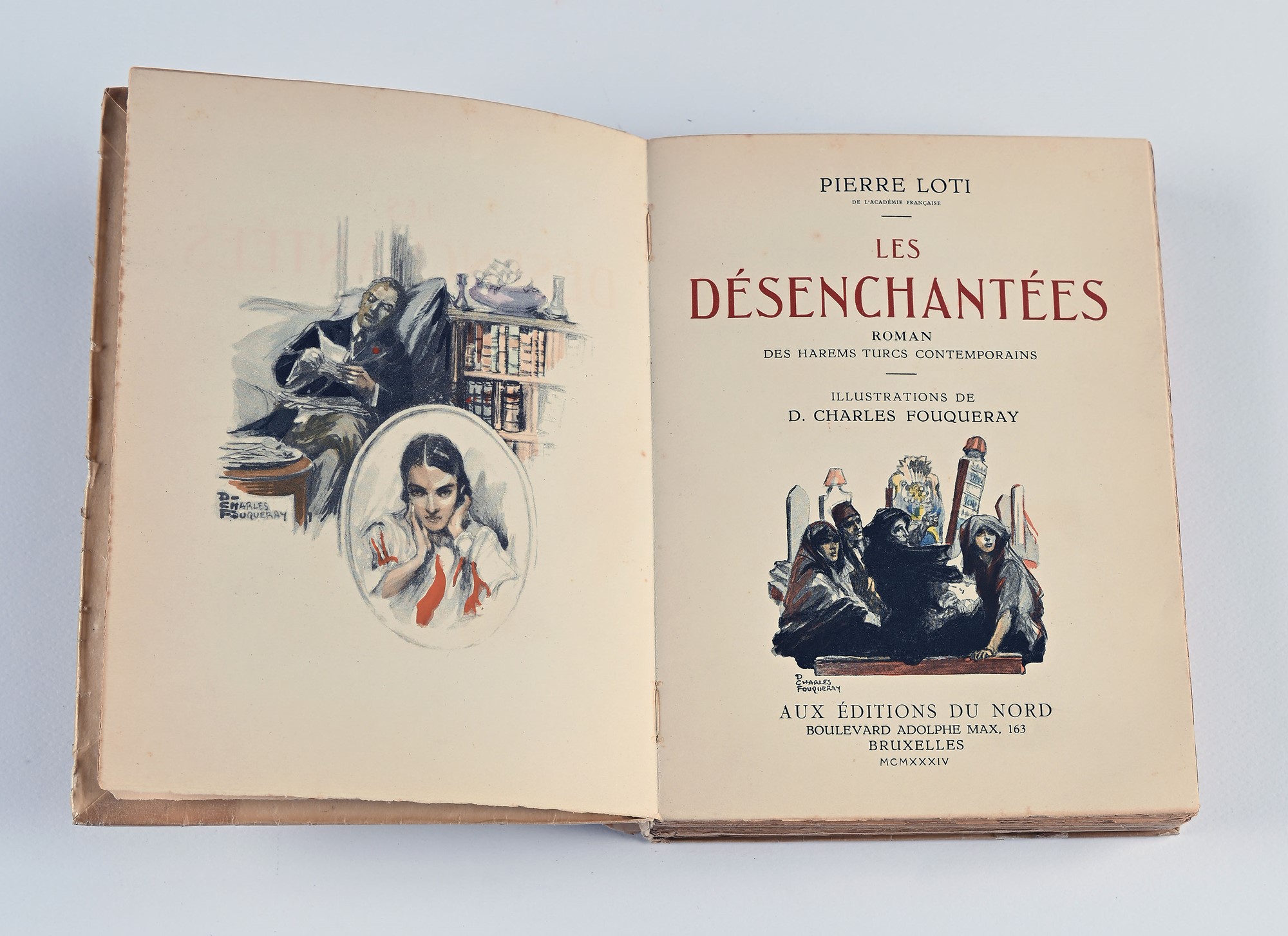 Loti, Pierre - LES DÉSENCHANTÉES 1 vol. Bross. ed. con pergamino. pp. 347 n. + tavv. ill., mm 205x155. Collezione Les Gloires Littéraires n. 18, con illustrazioni di D. Charles Fouqueray. Esemplare riservato all’illustratore dell’opera, numerato e dedicato a mano dall’editore. Testo a stampa 1934, Bruxelles, Aux éditions du nord mm 205x155