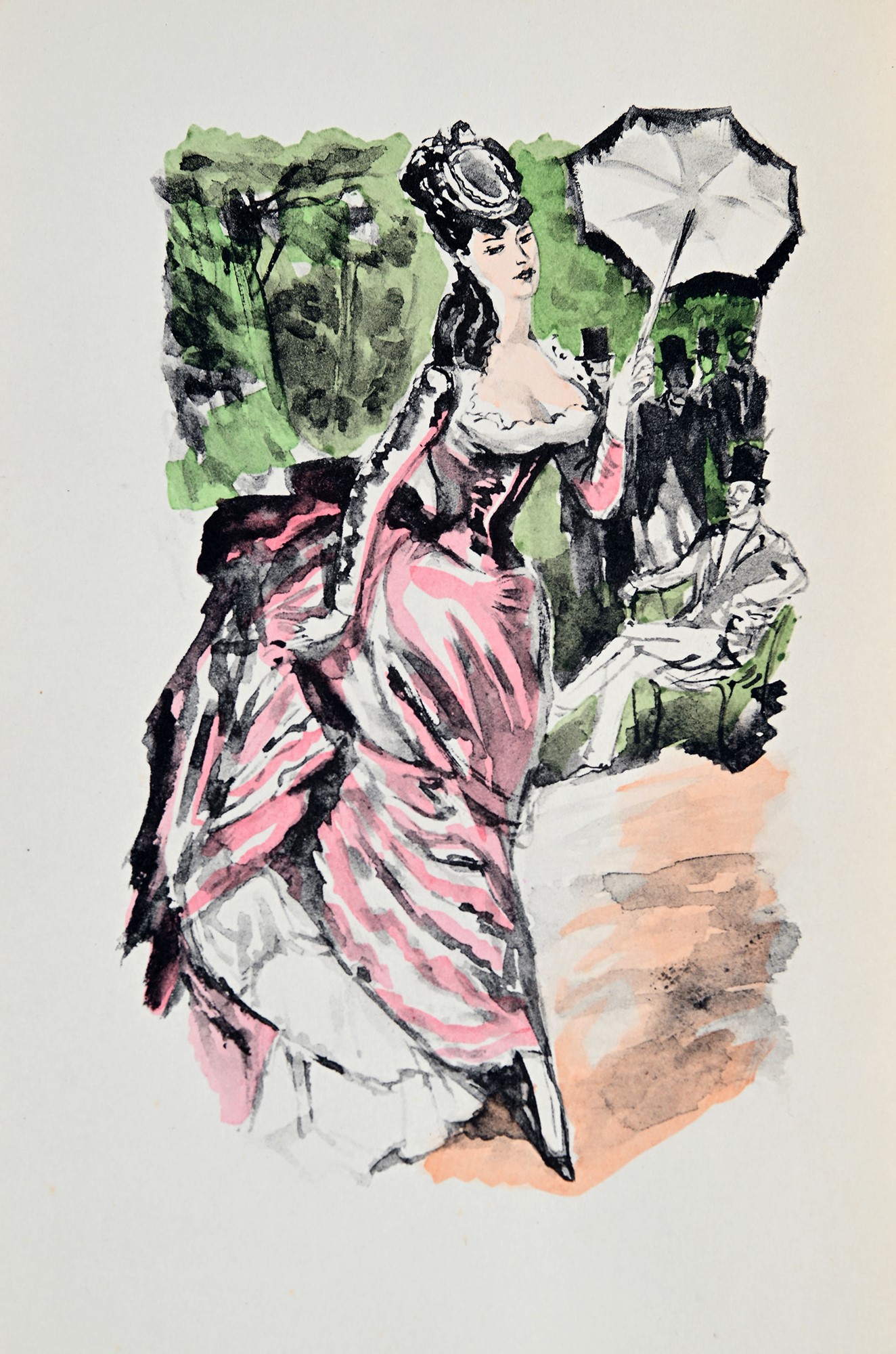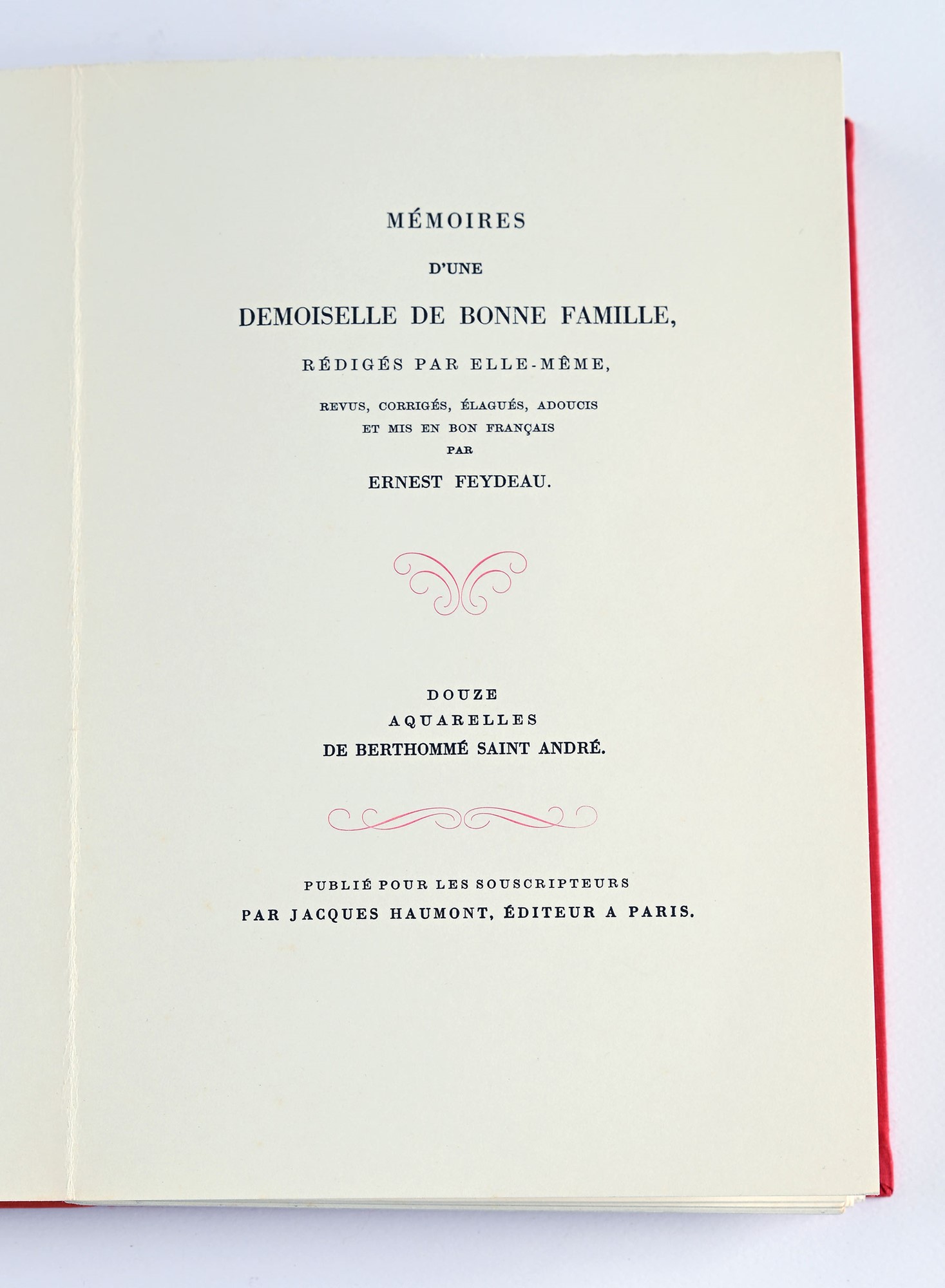Feydeau, E. (a cura di) - MÉMOIRES D’UNE DEMOISELLE DE BONNE FAMILLE, RÉDIGÉS PAR ELLE-MÊME. 1 vol. mm. 245X165, pp. [8]-115-[7] + 12 tavv. ill. Bross. ed. con titoli al piatto e al dorso, carte libere. Cartella in piena tela con tit. in oro al dorso, astuccio in tela. Con 12 acquerelli di Berthommé Saint André. Edizione numerata a mano (es. 97/405) con iniziali autografe dell’editore. Testo a stampa [ca 1950], Parigi, Jacques Haumont mm 245X165