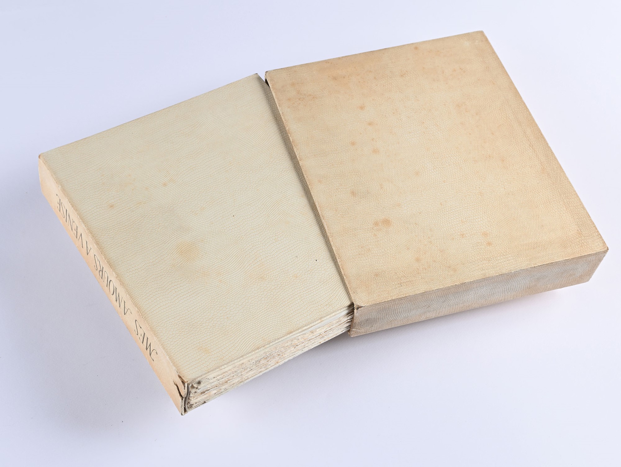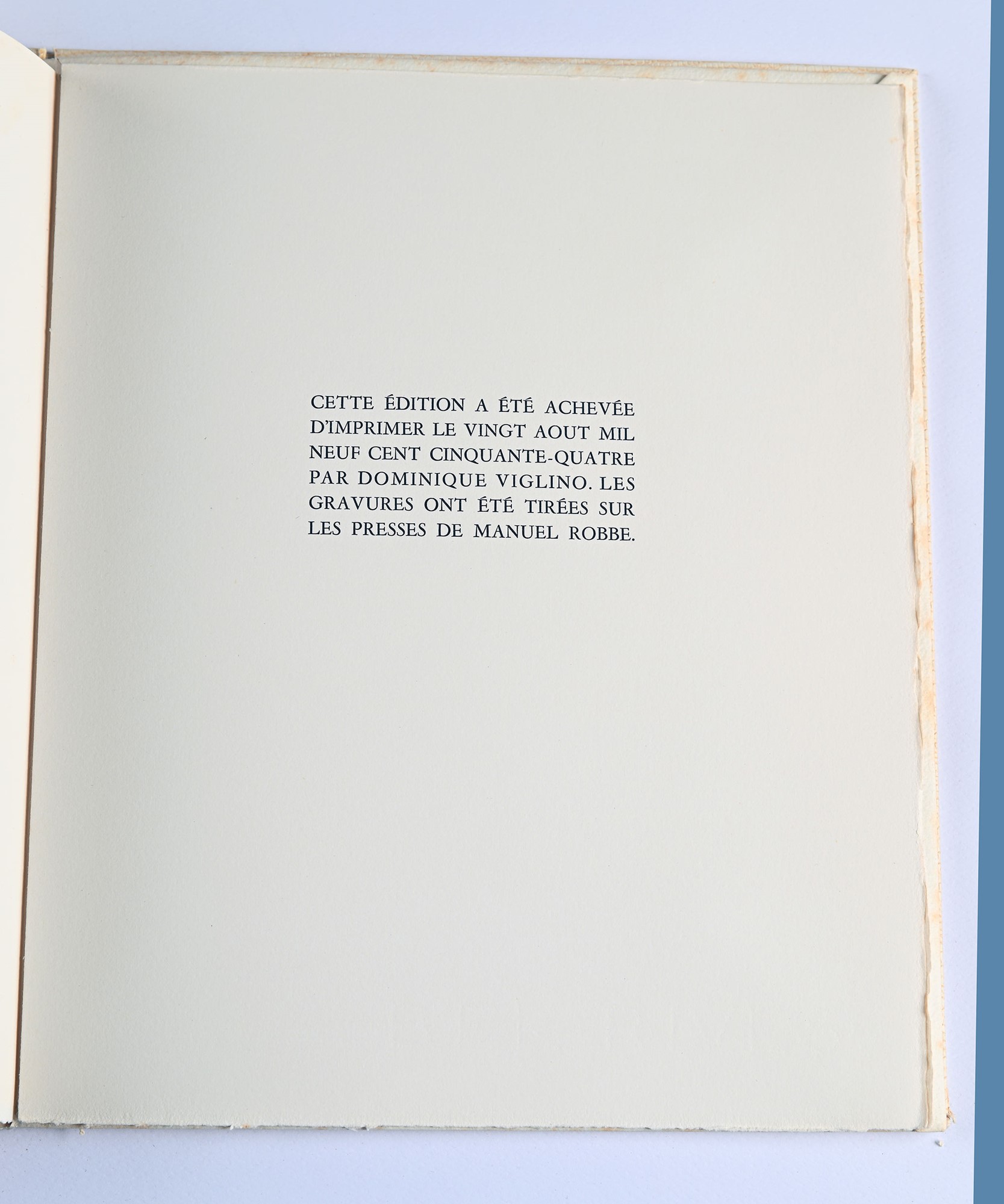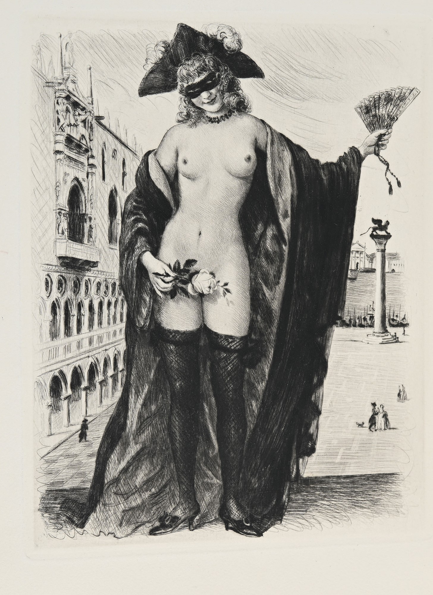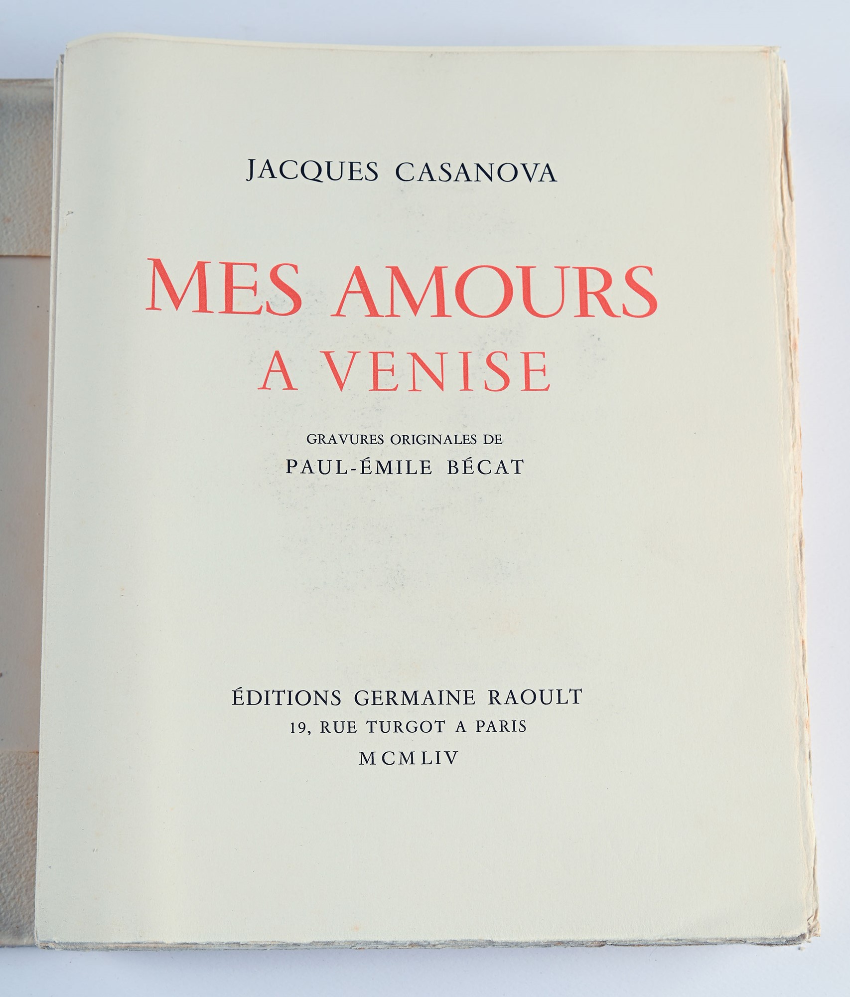 Casanova, J. - MES AMOURS A VENISE 1 vol. mm. 285X230, pp. 246-[4]. Bross. ed. con titoli al piatto, carte libere. Incisioni originali nel testo di P. E. Becat, tutte protette da veline. Edizione numerata (es. 130/390); cartella con titoli al dorso e cofanetto. Testo a stampa 1954, Parigi, Germaine Raoult mm 285X230