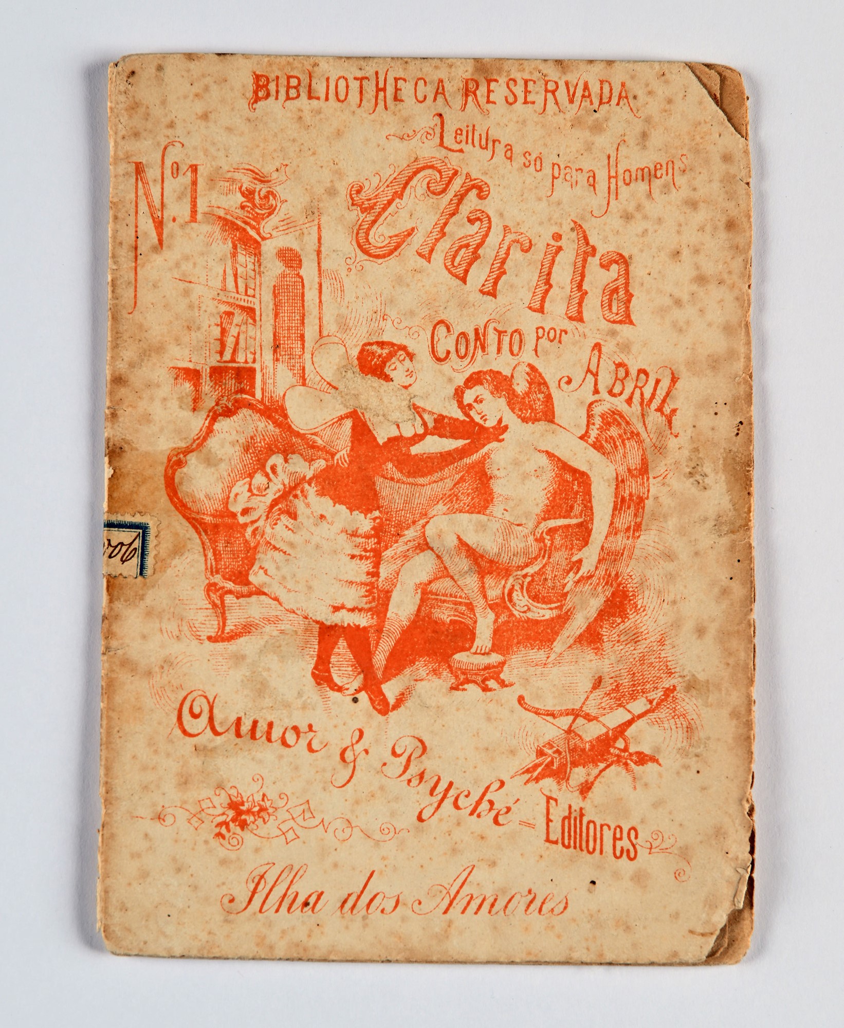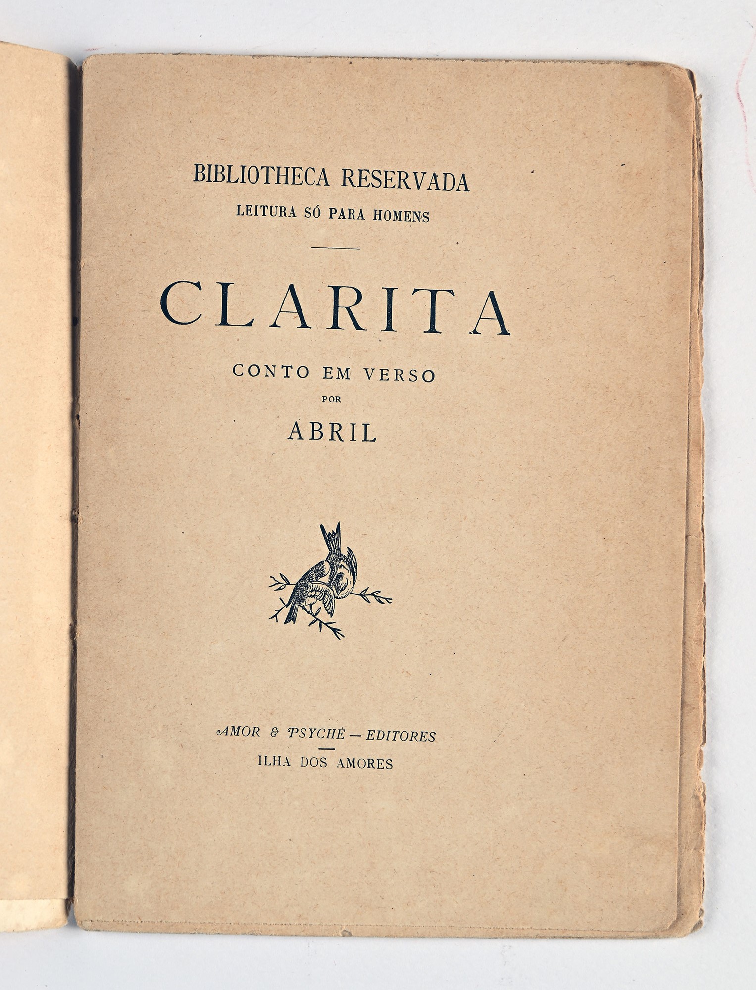 ANONIMO - CLARITA. CONTO EM VERSO POR ABRIL 1 vol. Bross. ed. pp. 16, mm 160x115. Collezione Bibliotheca reservada, leitura so para homens n. 1. Novella erotica portoghese con luogo di stampa di fantasia, risalente alla fine del XIX secolo o agli inizi del XX secolo. Piccole macchie in copertina, altrimenti in ottimo stato. Testo a stampa s.d., Ilha dos amores, Amor & Psyché mm 160x115