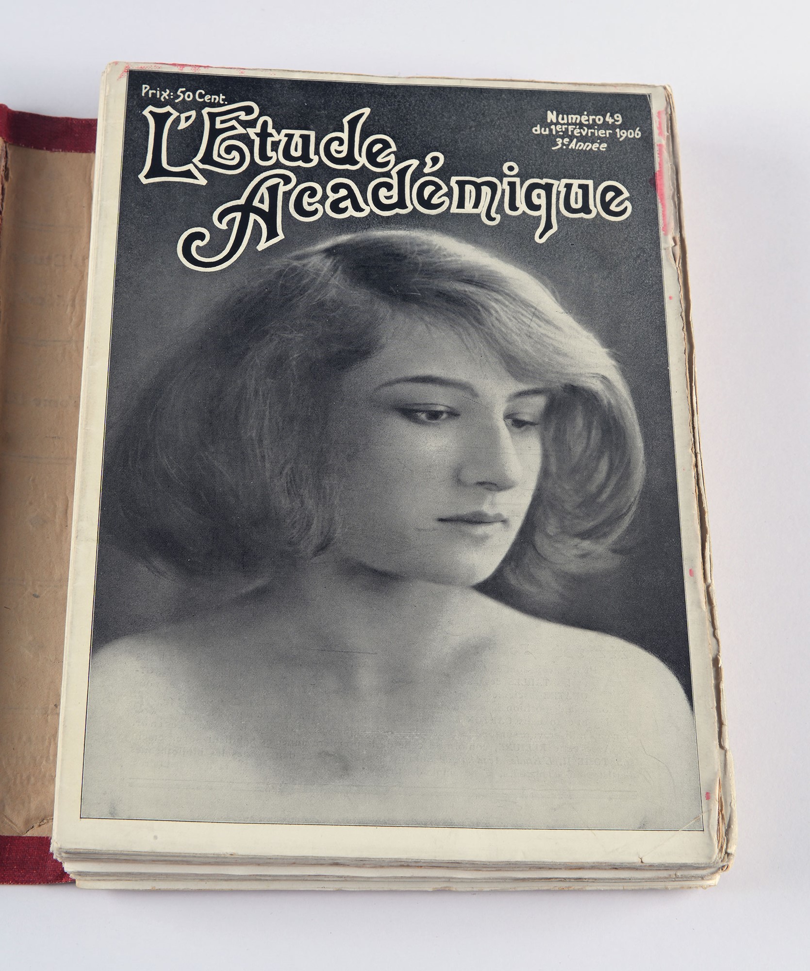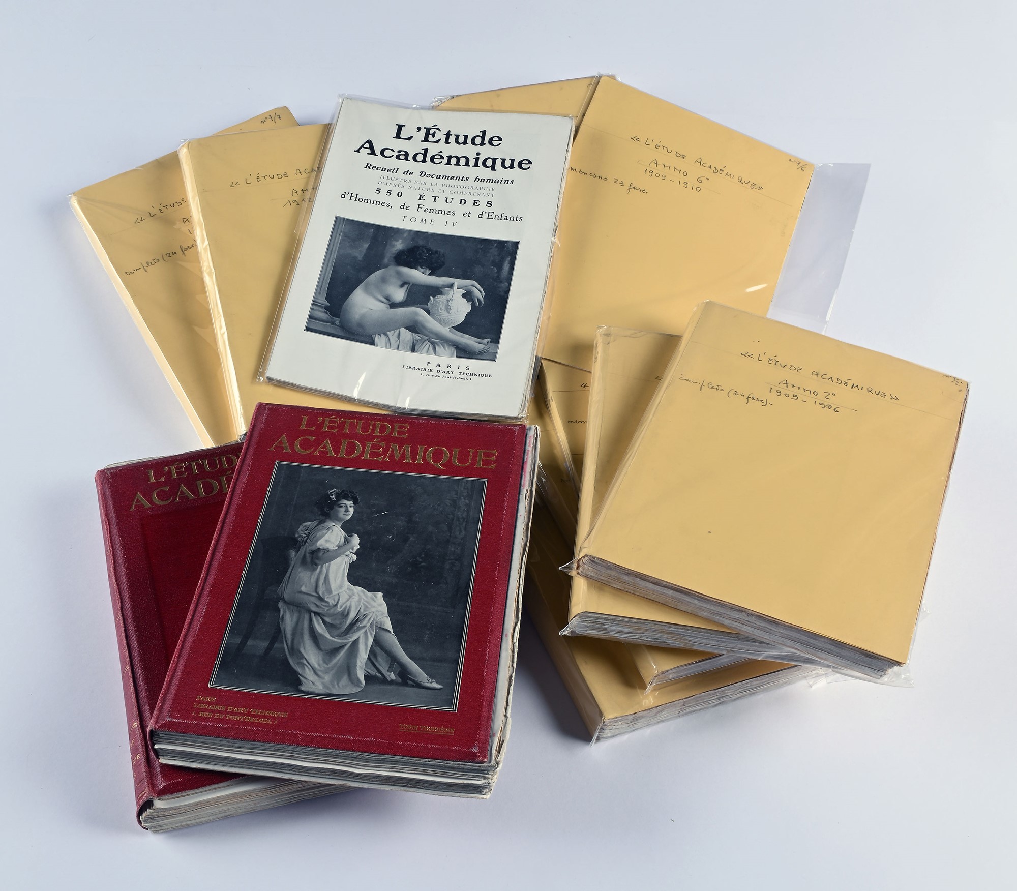 L’ÉTUDE ACADÉMIQUE Lotto composto da 10 volumi. Fascicoli mm 252x175. Pubblicazione francese, bimensile illustrato con centinaia di illustrazioni “d'aprés nature”; disponibili fascicoli e annate dal 1904 al 1915 molti dei quali conservano la copertina originale. Anno I 1904-1905, fasc. da 5 a 22. Anno II 1905-1906, completo in 24 fascicoli Anno III 1906-1907, completo in 24 fascicoli + astuccio editoriale Anno IV 1907-1908, completo in 24 fascicoli Anno V 1908-1909, completo in 24 fascicoli + astuccio editoriale Anno IV 1907-1908, fasc. 90, 92, 93, 95, 96, front/occh Anno VI 1909-1910, solo il fasc. 140 del 15 novembre 1909 Anno VII 1910-1911, completo in 24 fascicoli Anno VIII 1911-1912, completo in 24 fascicoli Anno IX 1912-1913, completo in 24 fascicoli Anno X 1913-194, front/occh 33 Anno XI 1914-1915, fasc. da 241 a 244, da 248 a 252 + 1 suppl. Le Modèle d'Artiste Almanach des beaux-arts 1905-1920 (escl. 1914), suppl. Annuale, 10 volumi Testo a stampa 1904-1915, Parigi, Librairie d'art technique mm 252x175