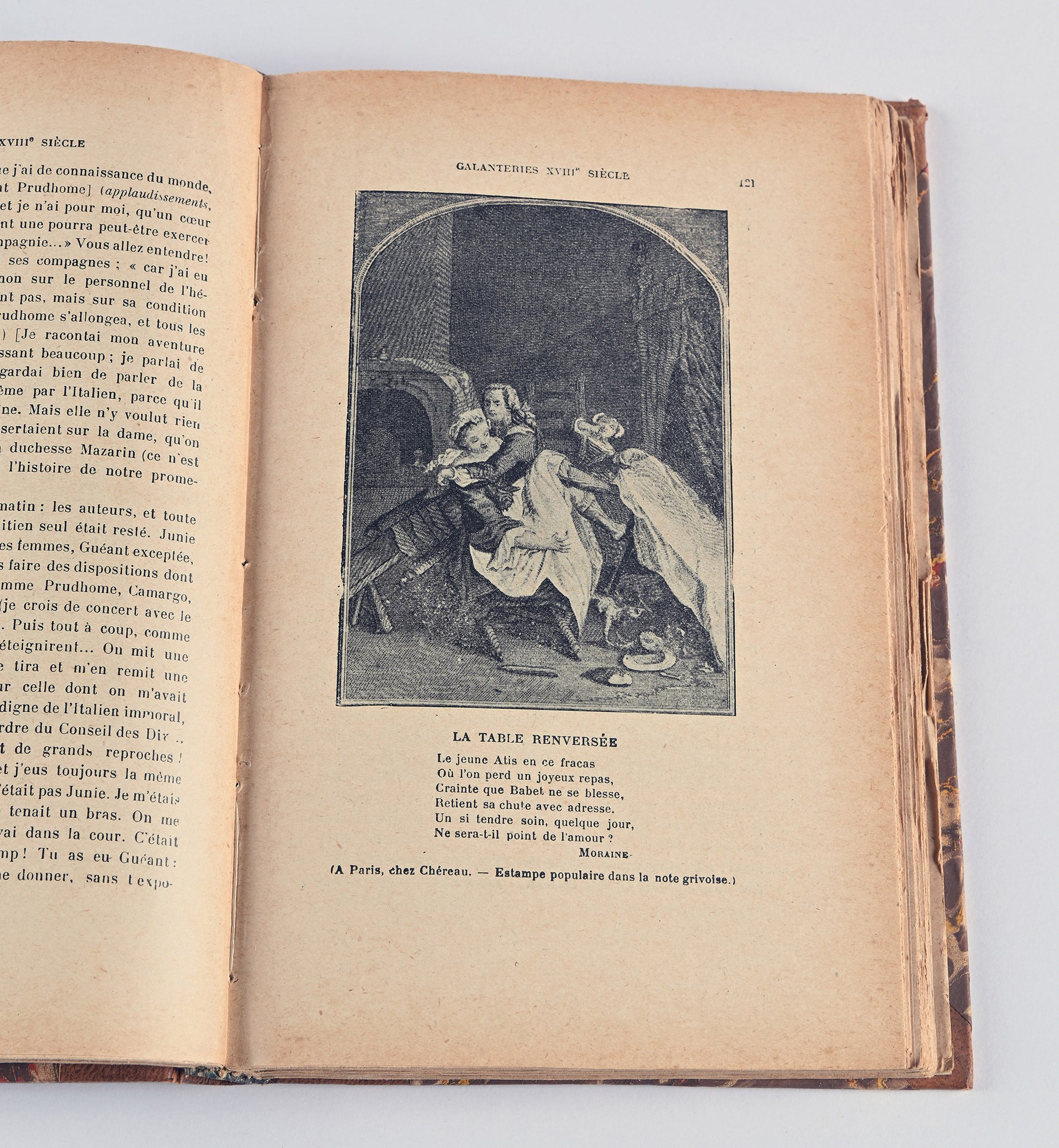 GRAND-CARTERET, JOHN - GALANTERIES XVIIIe SIECLE. VERS, PROSES, IMAGES 1 vol. Leg. mz pelle. pp. [4]-IV-320, mm 218x150. Volume illustrato, edizione di inizio Novecento (1905 ca). Rilegatura in mezza pelle, titoli e fregi in oro al dorso, brossura conservata. Testo a stampa s.d., Paris, Albin Michel mm 218x150