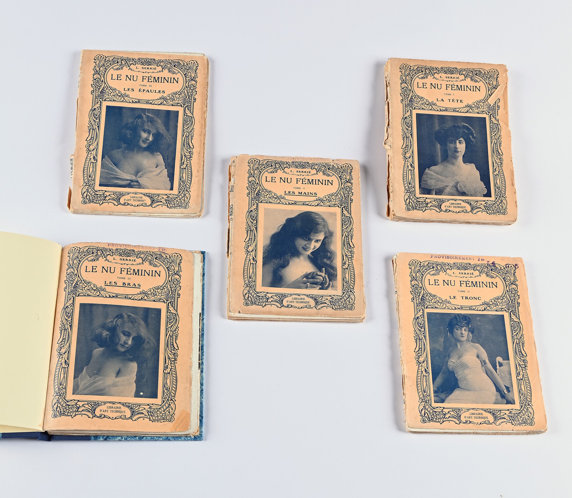 SERRIÉ, LOUIS - LE NU FÉMININ. COURS COMPLET D’ANATOMIE ARTISTIQUE A L’USAGE DES PEINTRES ET SCULPTEURS I-V 5 voll. (4 bross. ed. + 1 ril. post. mz tela). Rara pubblicazione francese di inizio ‘900, sono disponibili i primi 5 volumi, illustrati con numerose tavole nel testo. Testo a stampa s.d. (ca 1908), Paris, Librairie d’art technique mm 175x130