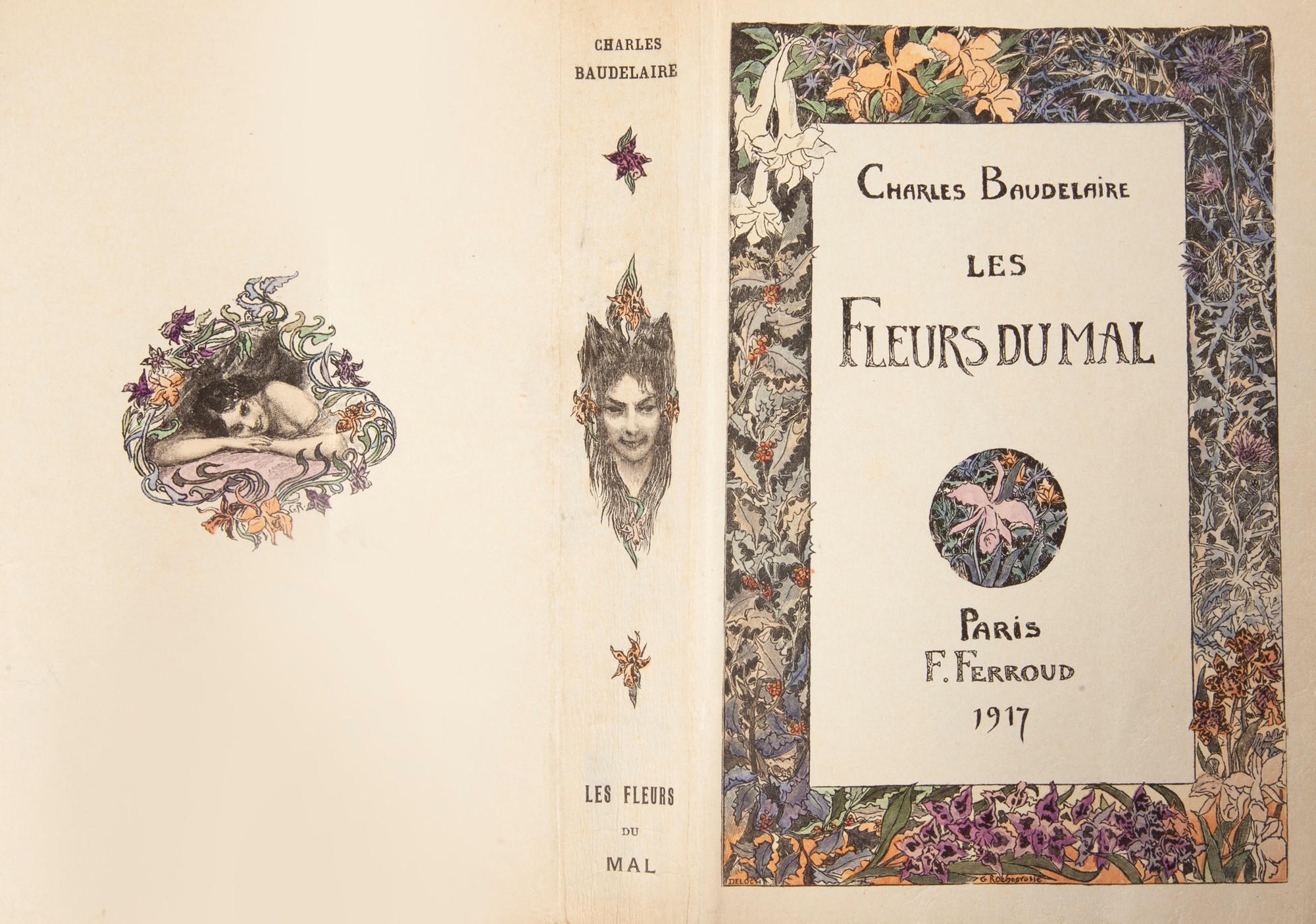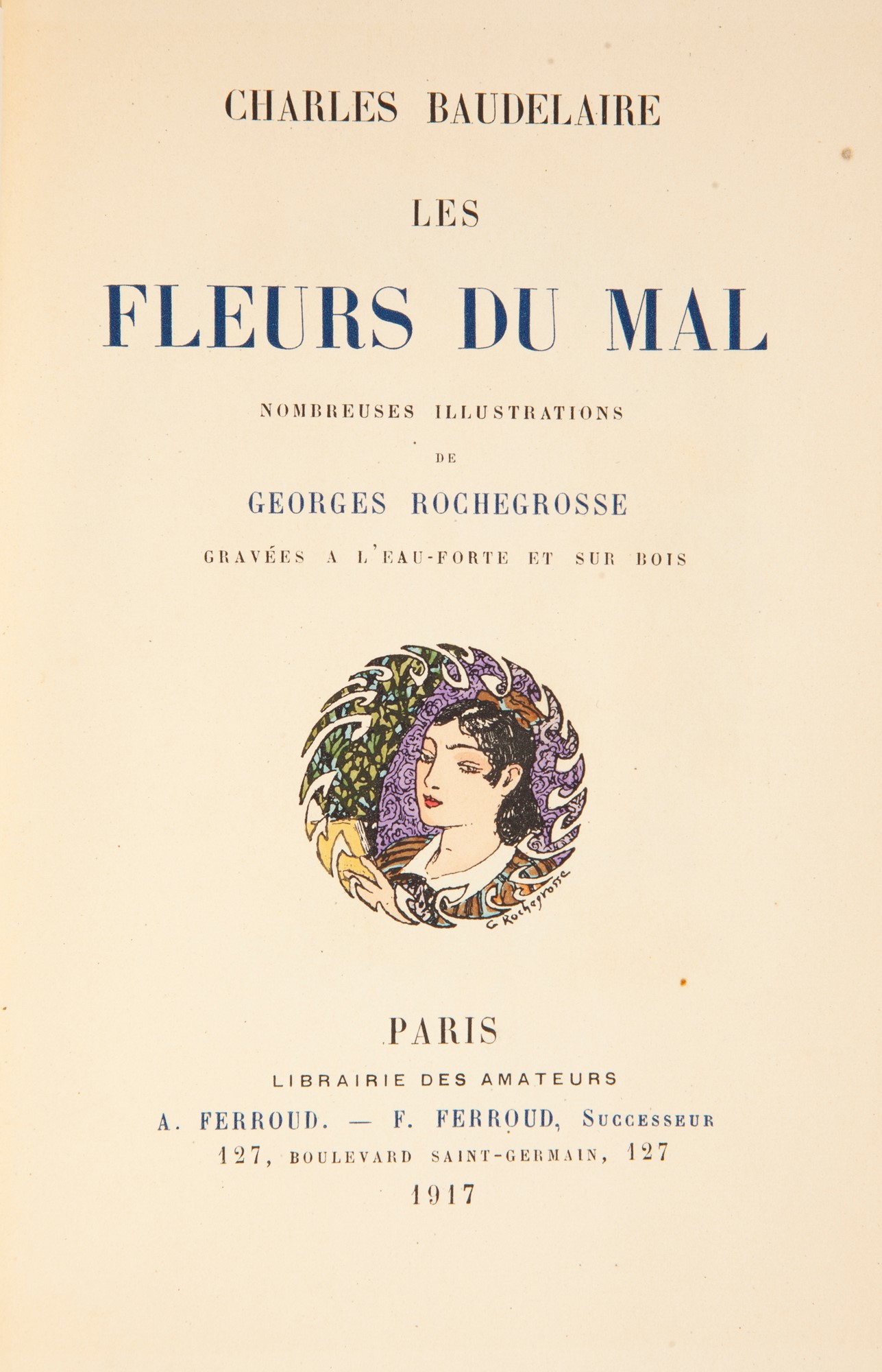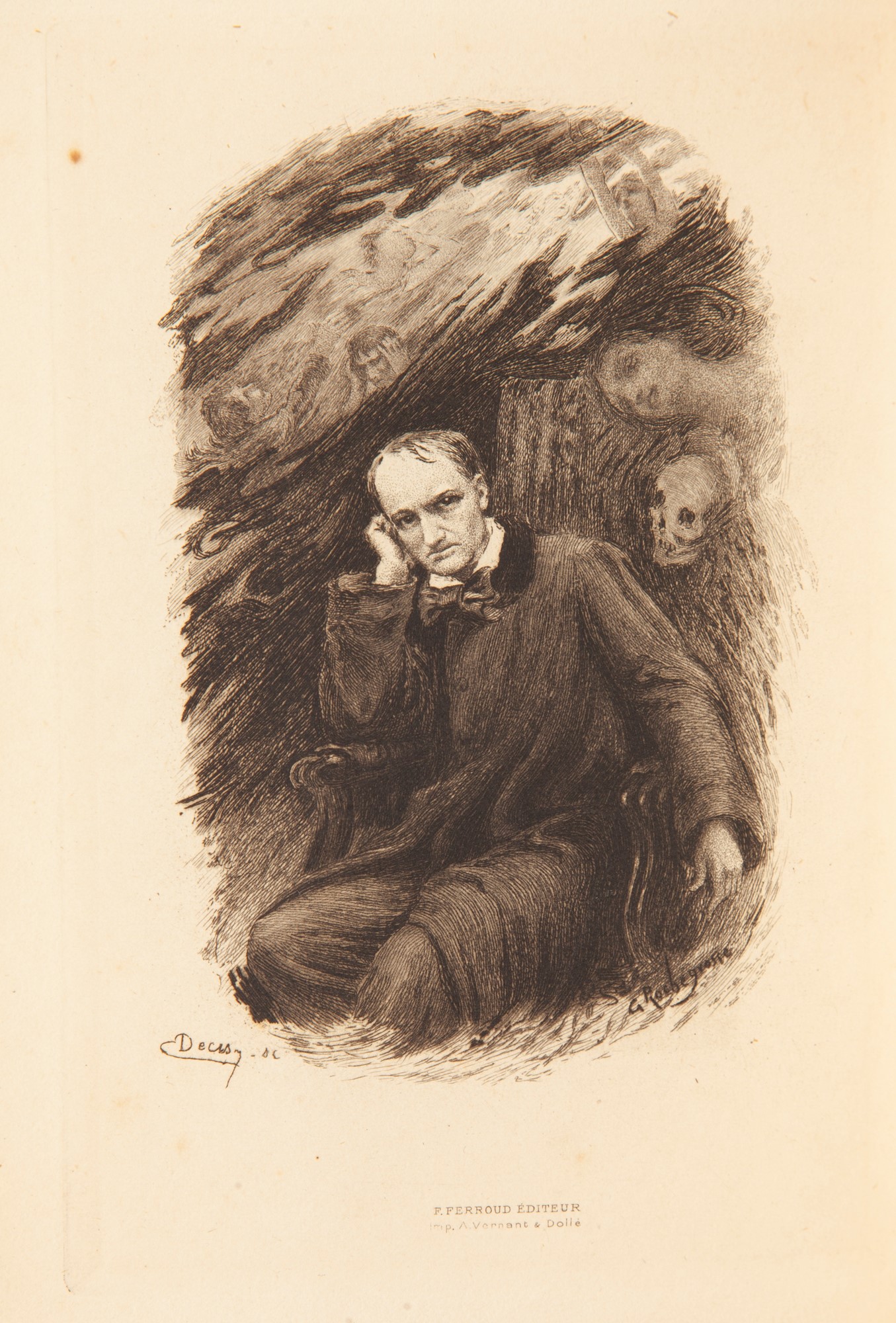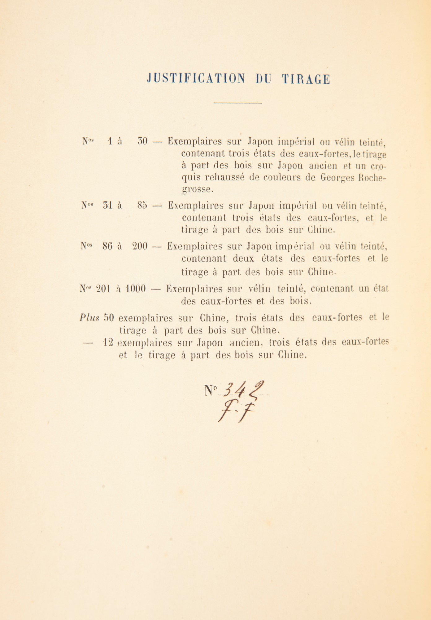 Edizione a tiratura limitata di 1062 esemplari, ns n.342, del cinquantesimo anniversario dalla prima edizione della serie Petite Bibliothèque Andréa della Librarie des Amateurs di A Ferroud. Illustrato con otto acqueforti colorate protette da veline, con antiporta raffigurante l'autore e numerose vignette nel testo opera del celebre illustratore Georges Antoine Rochegrosse. Copertine originali figurate conservate. Bella legatura artigianale novecentesca in piena pergamena con fregi e titolo in oro al piatto anteriore, tasselli in pelle con titolo e decorazioni in argento al dorso.