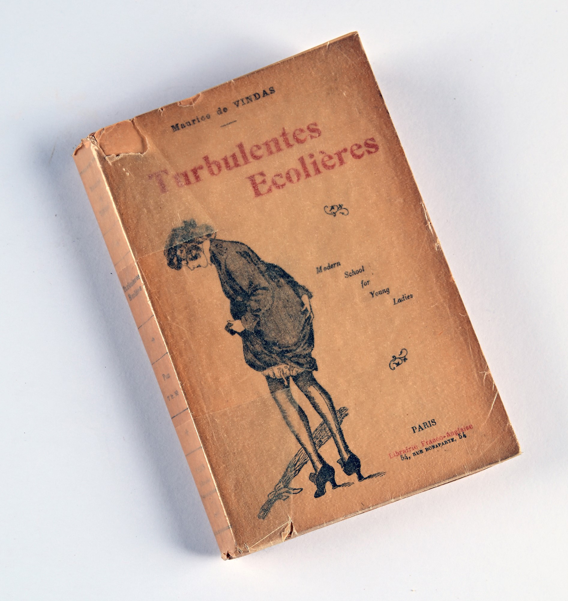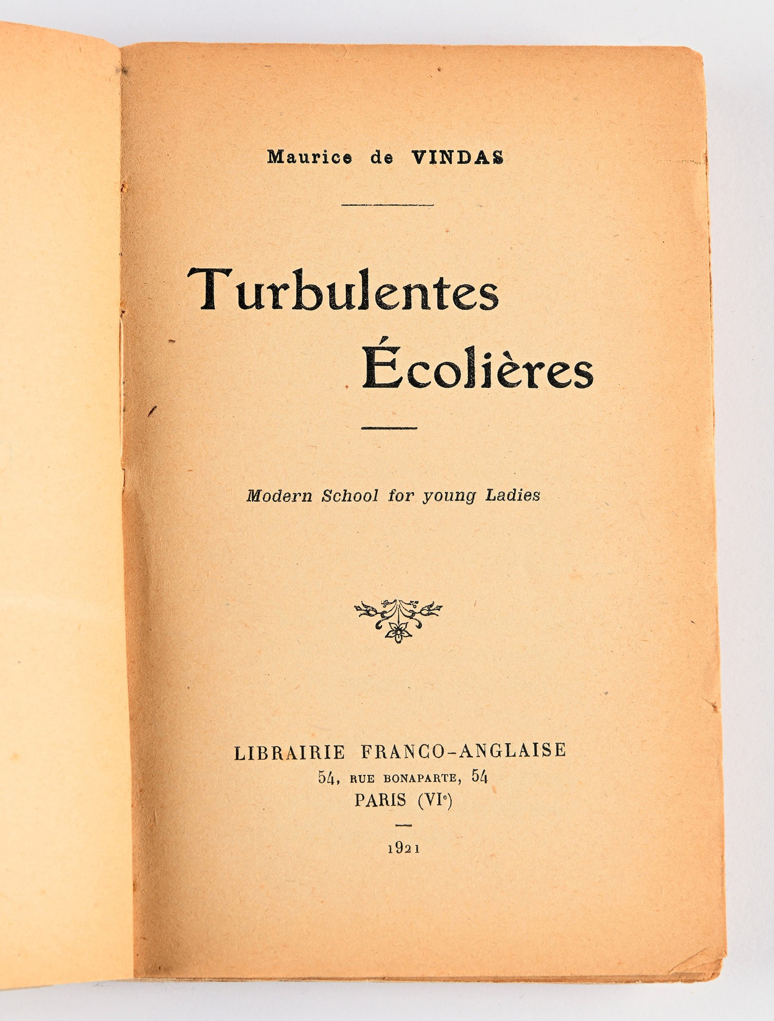 VINDAS (DE), MAURICE - TURBULENTES ECOLIÈRES. MODERN SCHOOL FOR YOUNG LADIES 1 vol. Bross. ed. con pergamino. pp. [4]-223-[5] + tavv. ill., mm 185x125. Con ex-libris erotico di Costantini. Testo a stampa 1921, Paris, Librairie franco-anglaise mm 185x125