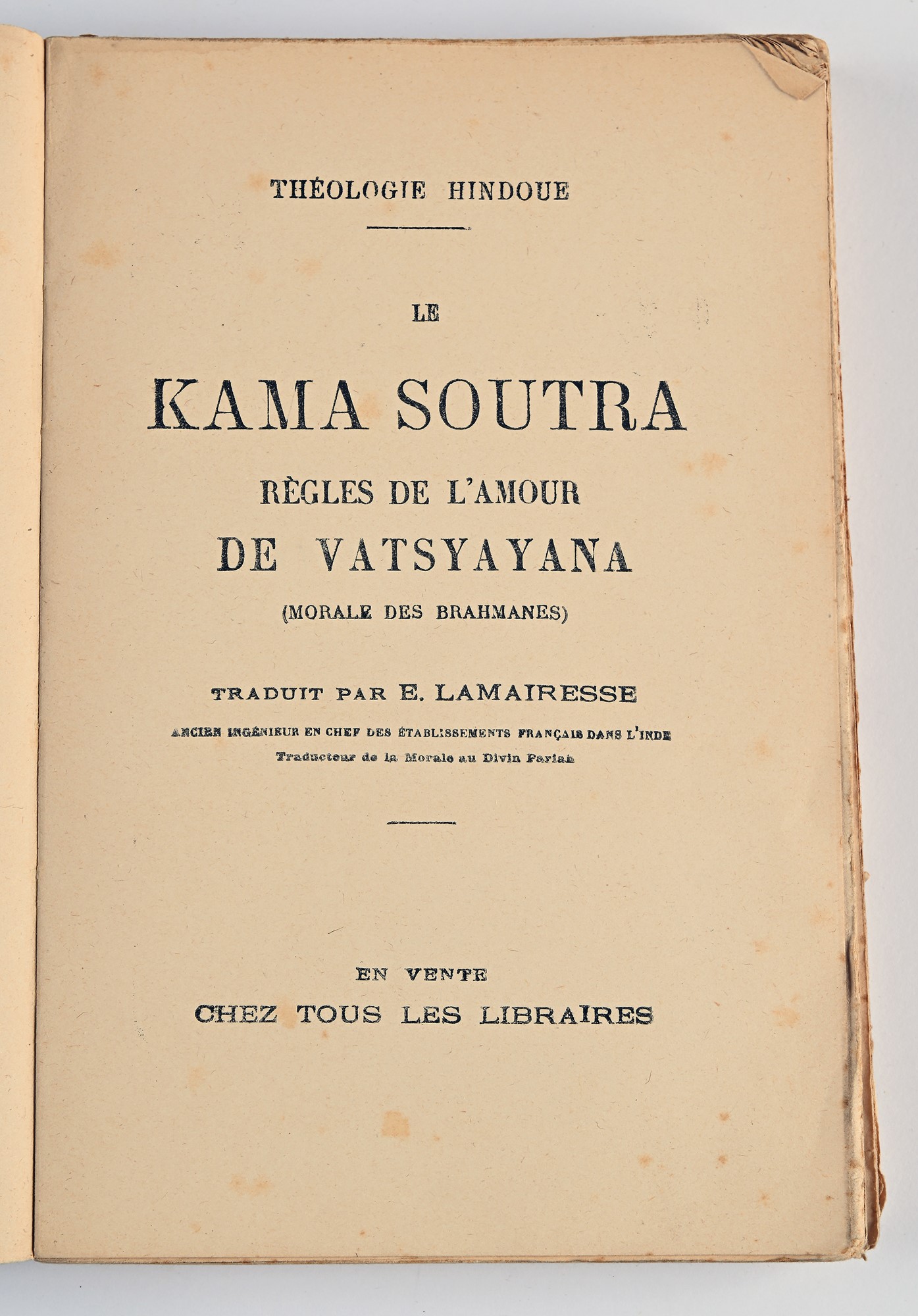 VATSYAYANA - LE KAMA SOUTRA REGLES DE L’AMOUR 1 vol. Bross. ed. pp. xxxv-297, mm 252x165. Traduzione di E. Lamairesse, illustrazione in copertina di Henri Armengol. Brossura sezionata. Testo a stampa 1929, Paris, imp. Ramlot mm 252x165