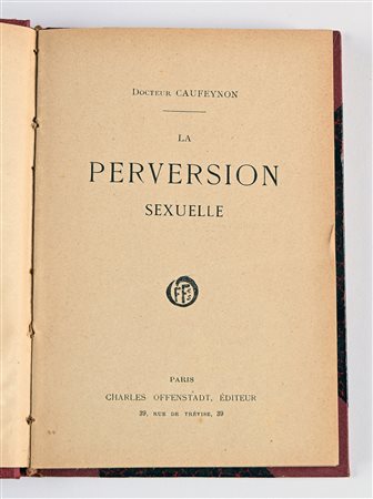 CAUFEYNON, DOCTEUR - LA PERVERSION SEXUELLE 1 vol. Ril. post. mz tela. mm 188x134, pp. 108+[36] di pubbl. Saggio francese di igiene e psicologia, edizione senza data della prima metà del ‘900. Testo a stampa s.d., Paris, Charles Offenstadt mm 188x134