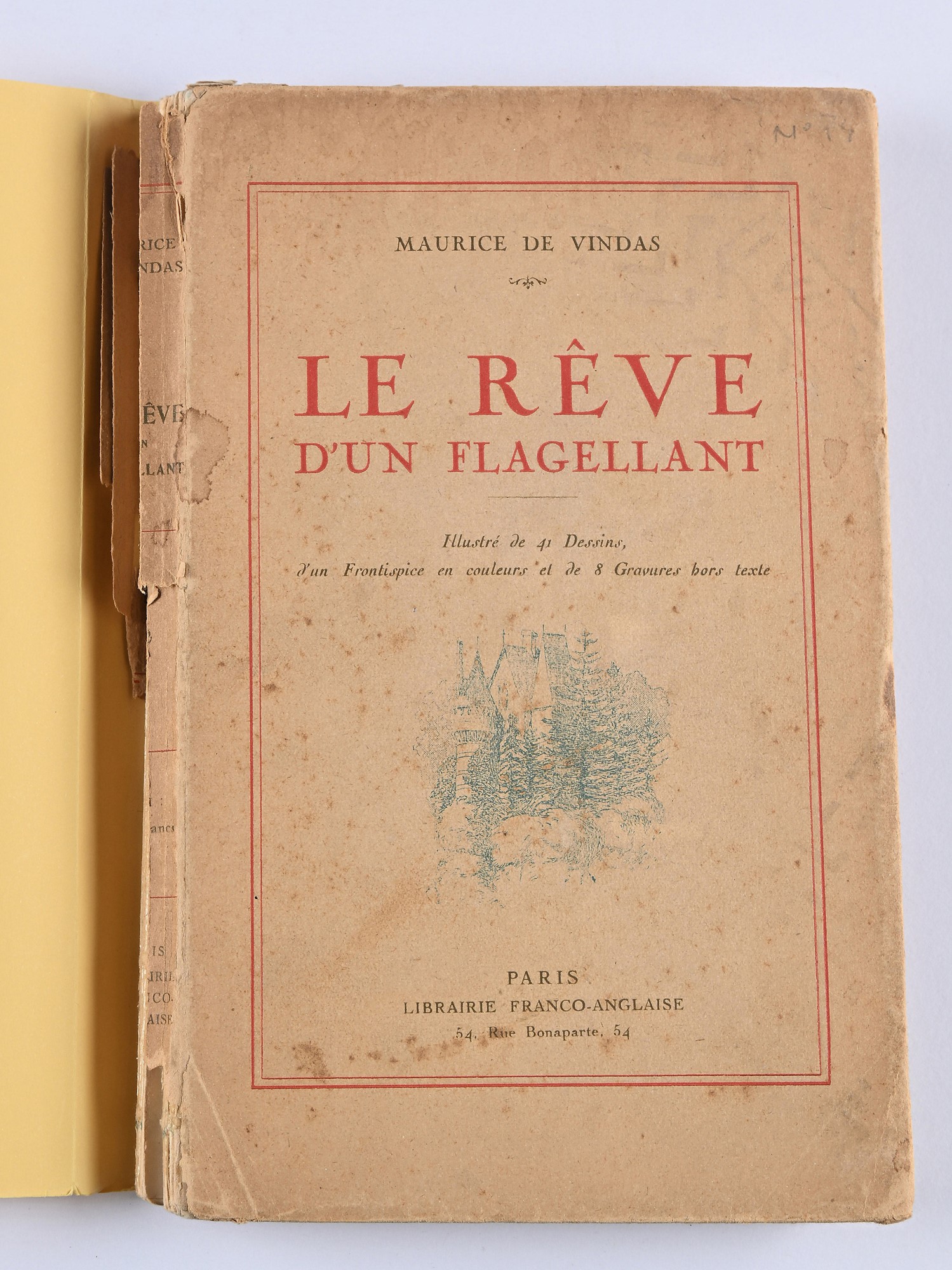 VINDAS, MAURICE (DE) - LE RÊVE D’UN FLAGELLANT 1 vol. Bross. ed. pp. 223-[1], mm 225x145 + 9 tavv. ill. Rara monografia sulla pratica dello spanking, edizione originale francese degli anni ‘20. Volume illustrato con 41 disegni nel testo, 1 antip. a col. e 8 tavole fuori testo. Testo a stampa 1921, Paris, Librairie franco-anglaise mm 225x145