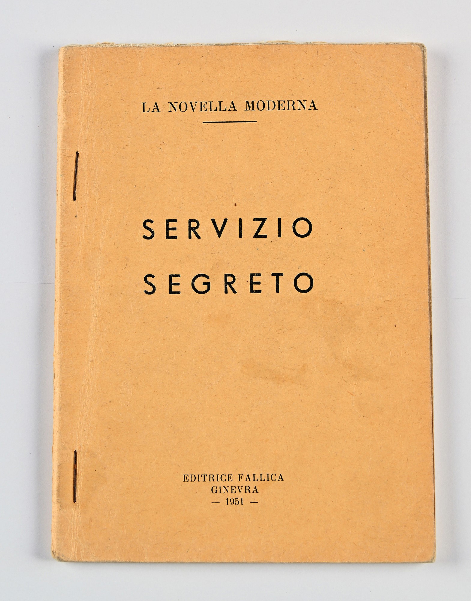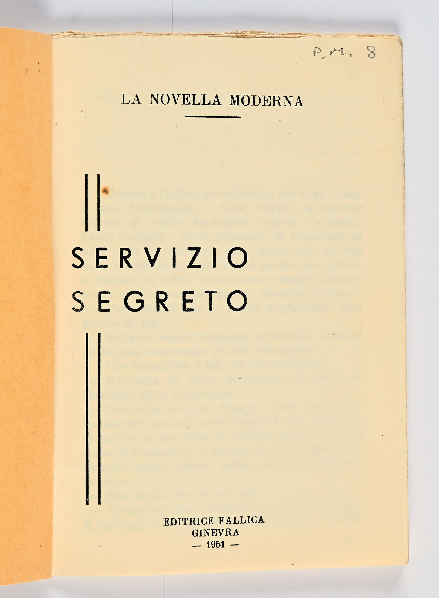 ANONIMO - SERVIZIO SEGRETO 1 vol. Bross. ed. pp. 64 + 9 tavv. ill., mm 170x125. Collezione La novella moderna. Volume illustrato, con tavole in nero f.t. Testo a stampa 1951, Ginevra, editrice fallica mm 170x125