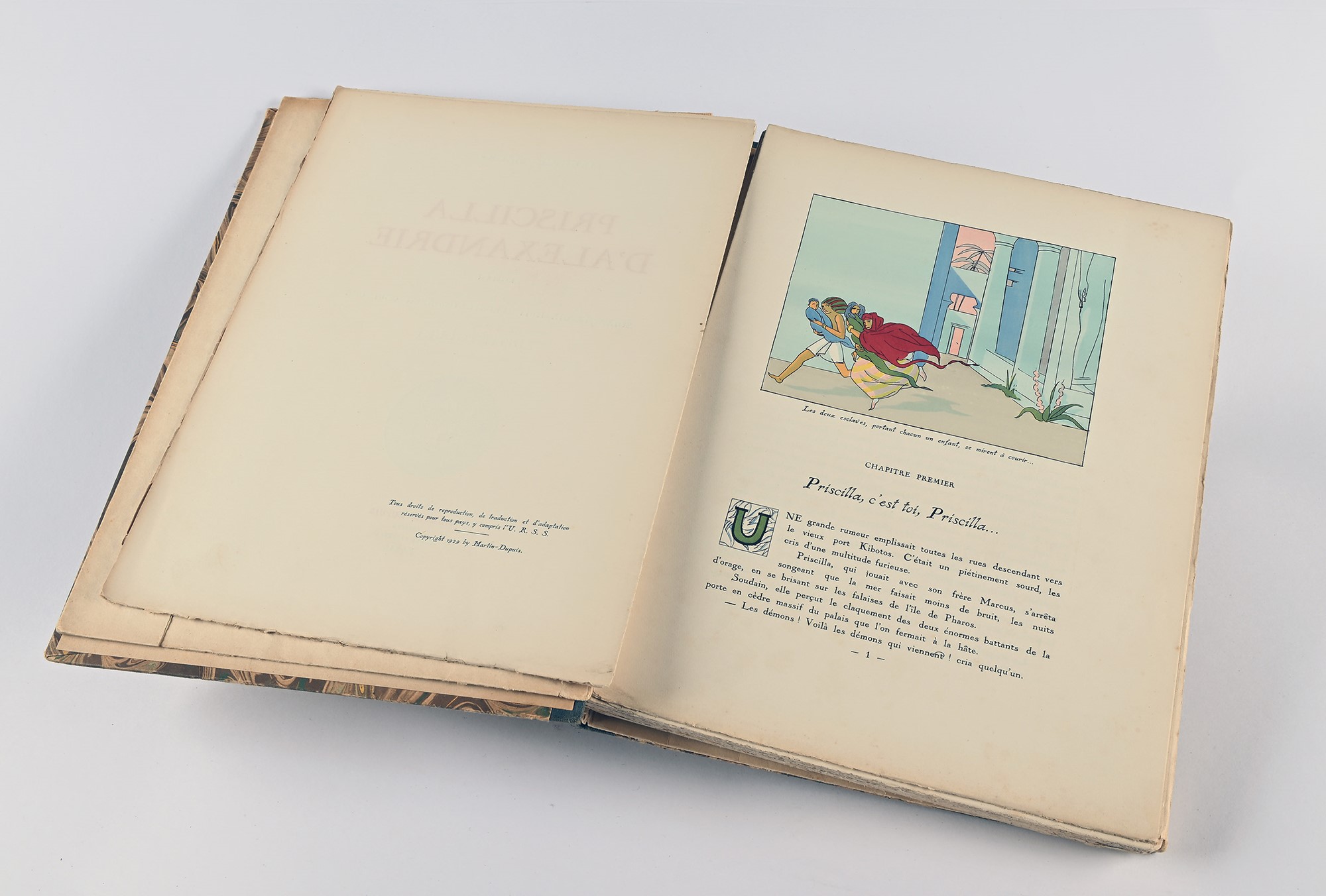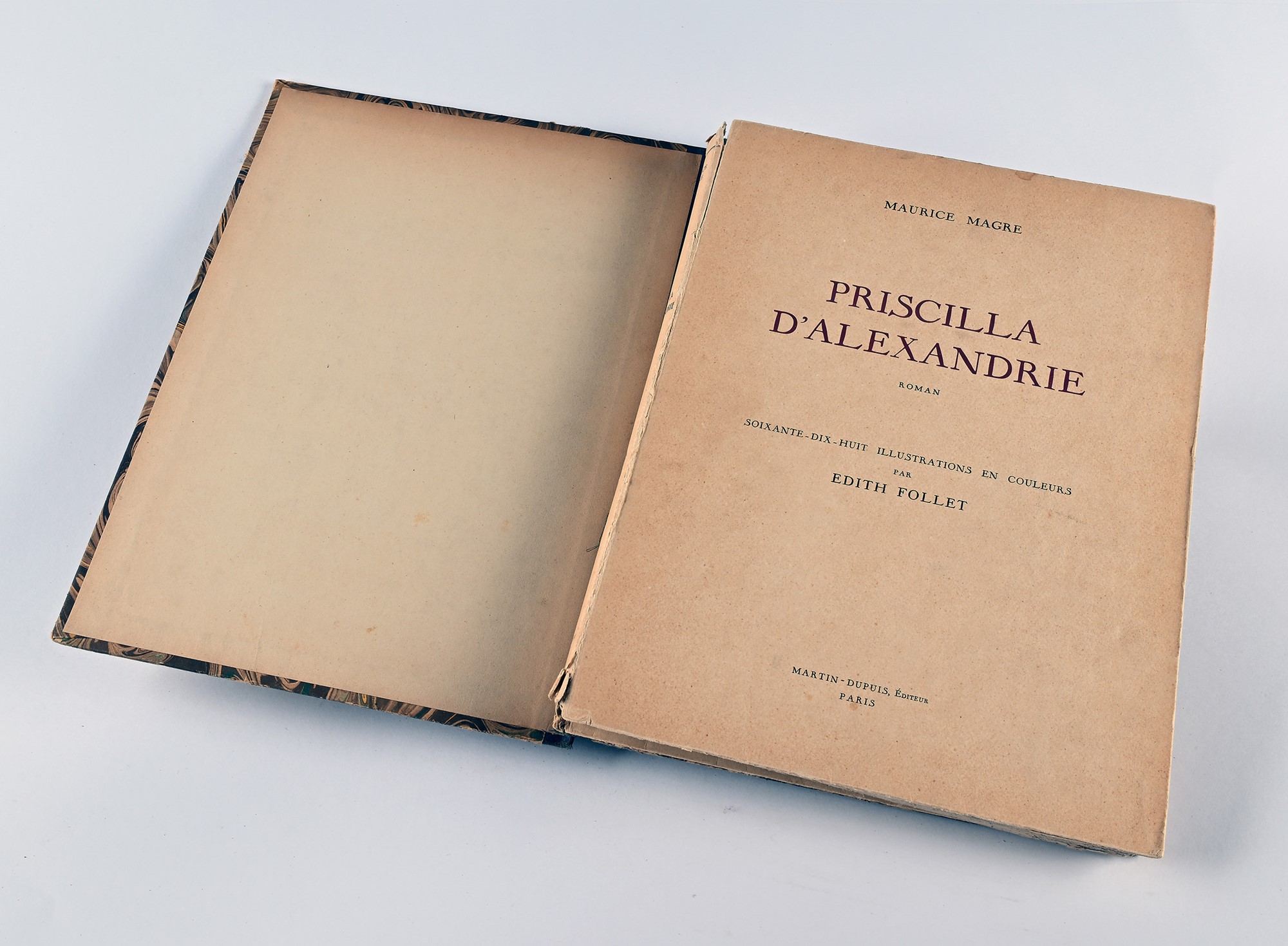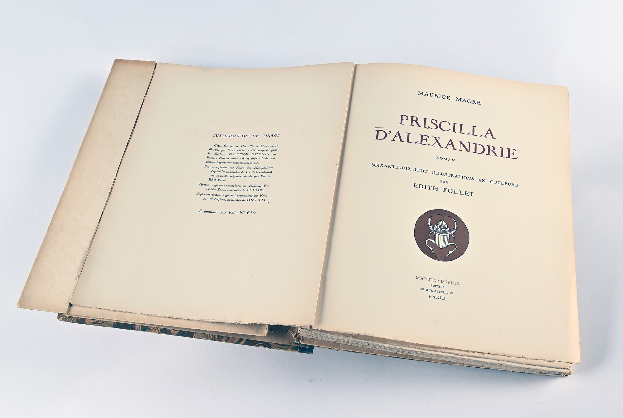 MAGRE, MAURICE - PRISCILLA D'ALEXANDRIE. ROMAN Non completo, mancante di 2 tav. ill. - In folio mm 335x265, testo a fascicoli sciolti in cartella editoriale con titoli al piatto e al dorso, p. (4), [4], 221, [6], (5) + 12 di 14 tavole fuori testo, mancanti la tav. X e la tav. XI. Tiratura numerata, es. stampato su Velina n. 612/850, edizione illustrata da Edith Follet, con vignette e culs-de-lamp nel testo, 12 stencil col. a pochoir delle 14 previste (13 + antip.). Con un piccolo strappo marginale di 2 cm a p. 221-222, lievi piccole fioriture fino a pag. 8, difetti alla cartella ed. Testo a stampa 1929, Paris, Martin-Dupuis mm 335x265