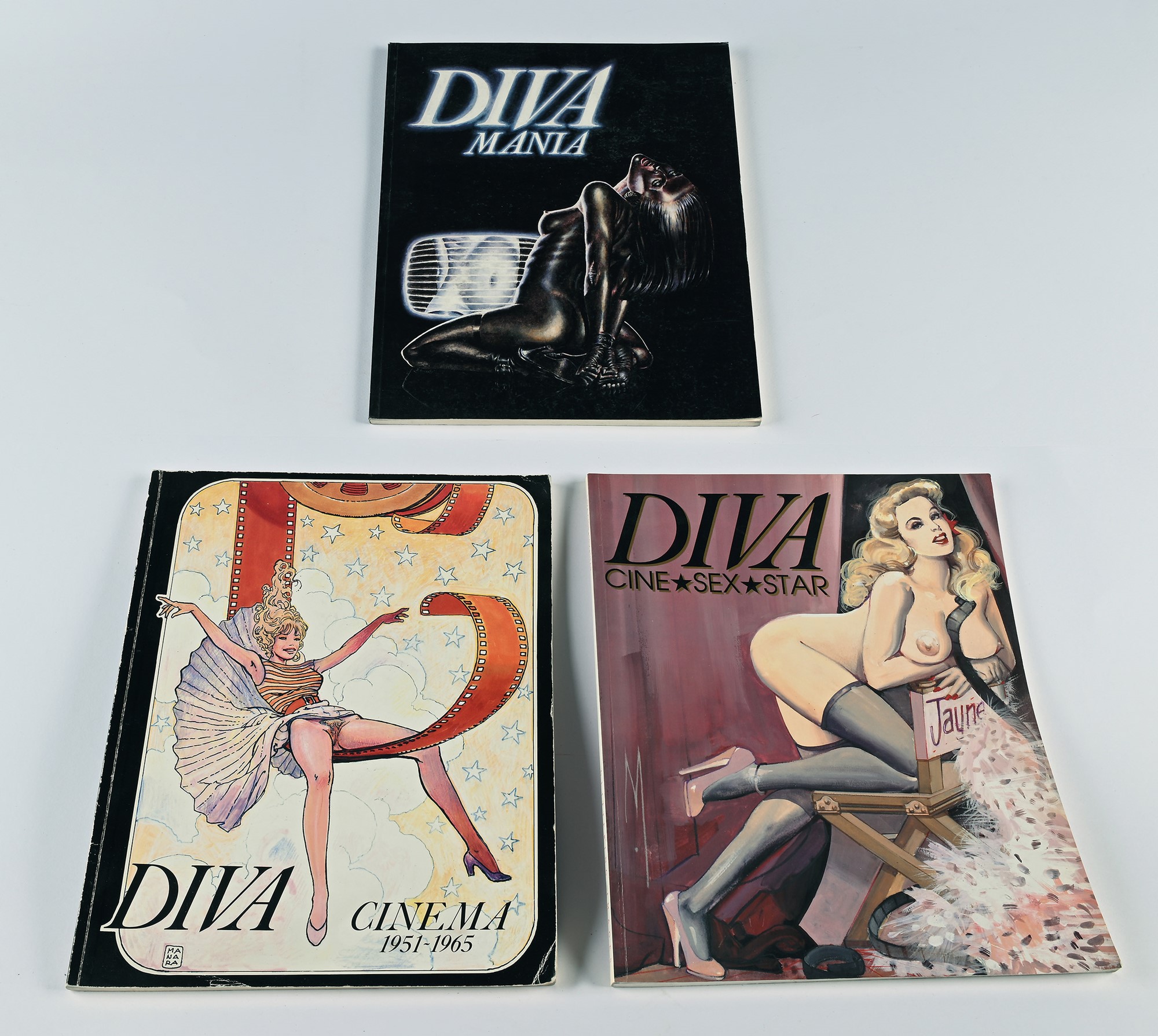 DIVA CINEMA 1951-1965 / DIVA CINE SEX STAR / DIVA MANIA 3 voll. Brossura editoriale. pp. 94, mm 330x260. Volumi illustrati. Copertine di Milo Manara e altri. Apprezzata rivista-libro uscita dal 1985 al 1996, il lotto include 3 numeri. Testo a stampa 1989-1990 mm 330x260
