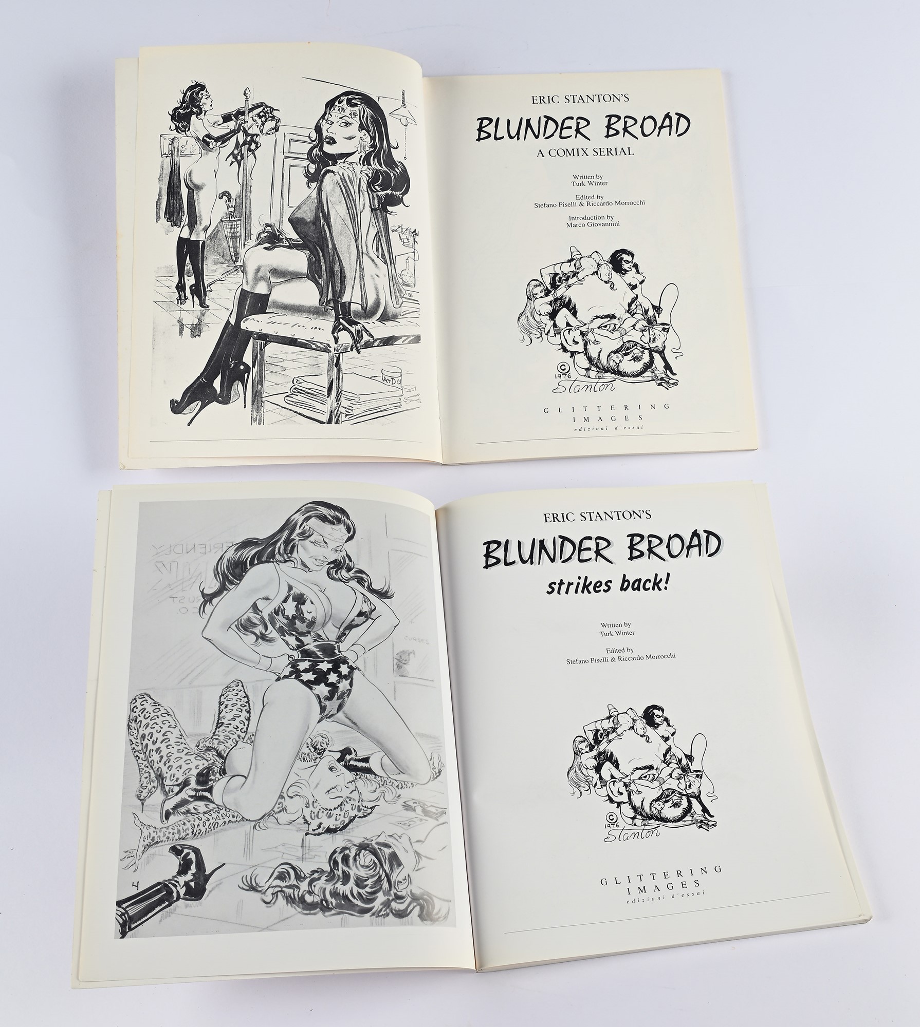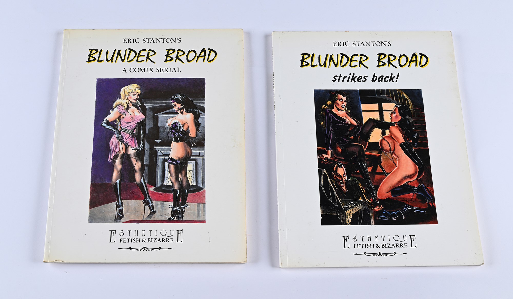 STANTON, ERIC - ERIC STANTON’S BLUNDER BROAD. Vol. 1-2 2 voll. Bross. ed. pp. 88+128, mm 310x240. Collana Esthetique fetish & bizarre. Grandi albi di fumetti per adulti, opera in 2 parti: include “B.B. A comix serial” e “B.B. Strikes back!”. Testo a stampa 1991/1996 mm 310x240
