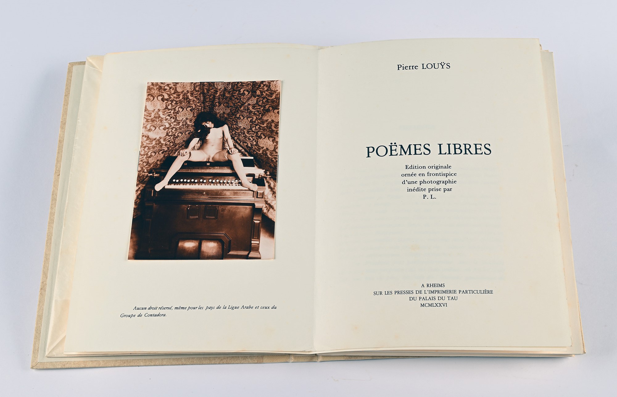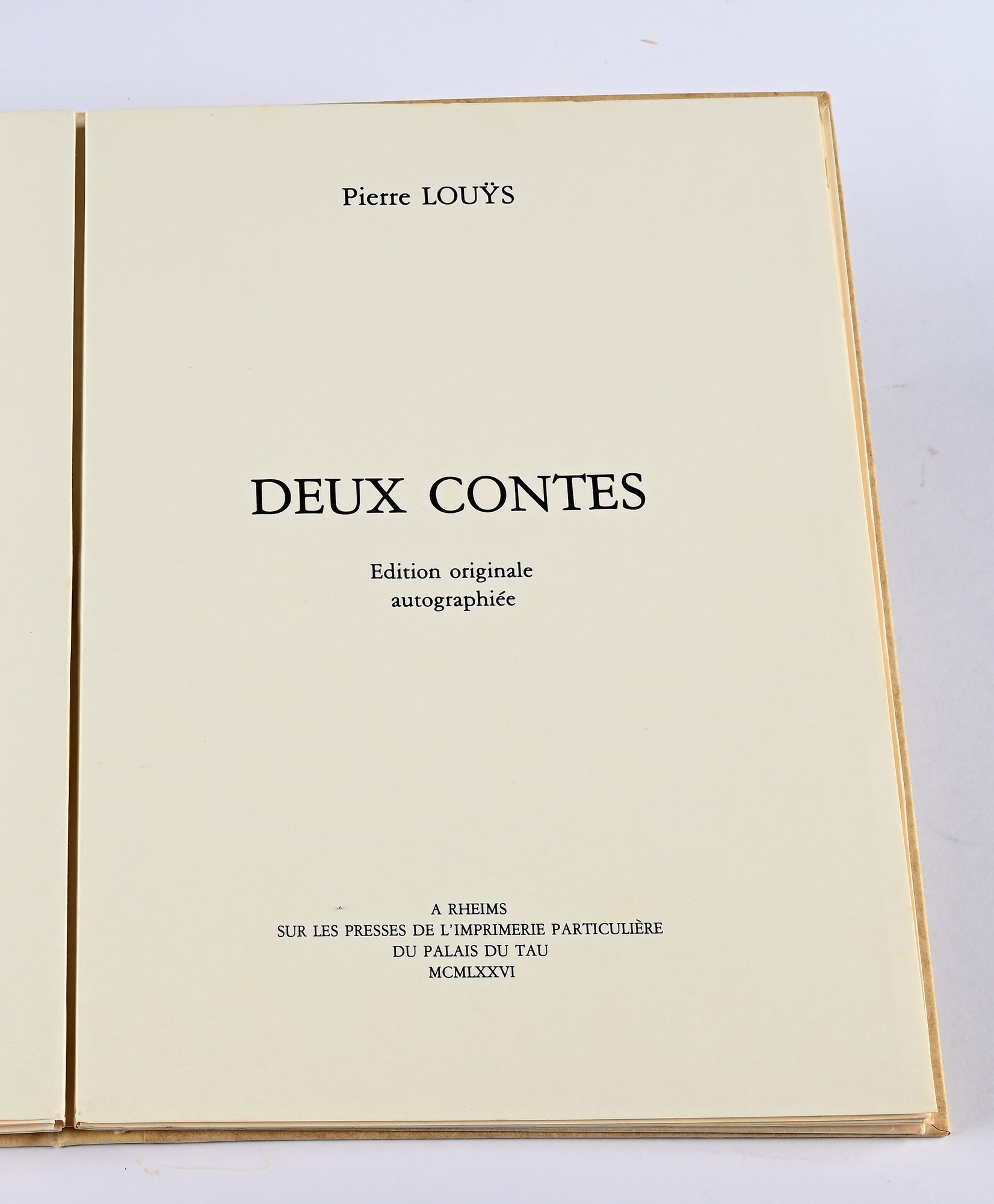 1976, Rheims, sur les presses de l’imprimerie particulière du Palais du Tau. mm 302x206. Testo a stampa. 2 voll. Cart. ed. pp. 42+27, mm 302x206. Due volumi bross. a carte mobili, con sovracopertina ill. protetta da pergamino, una cartella editoriale e un cofanetto. Il primo volume è di poesie, con una antip. ornata da una foto inedita eseguita da P. L.; il secondo volume riproduce in fac-simile un racconto manoscritto. Edizione originale a fogli sciolti di 175 esemplari su carta velina avorio, questa copia è la n. 164. Esemplare sprovvisto della serie di fotografie originariamente allegata.