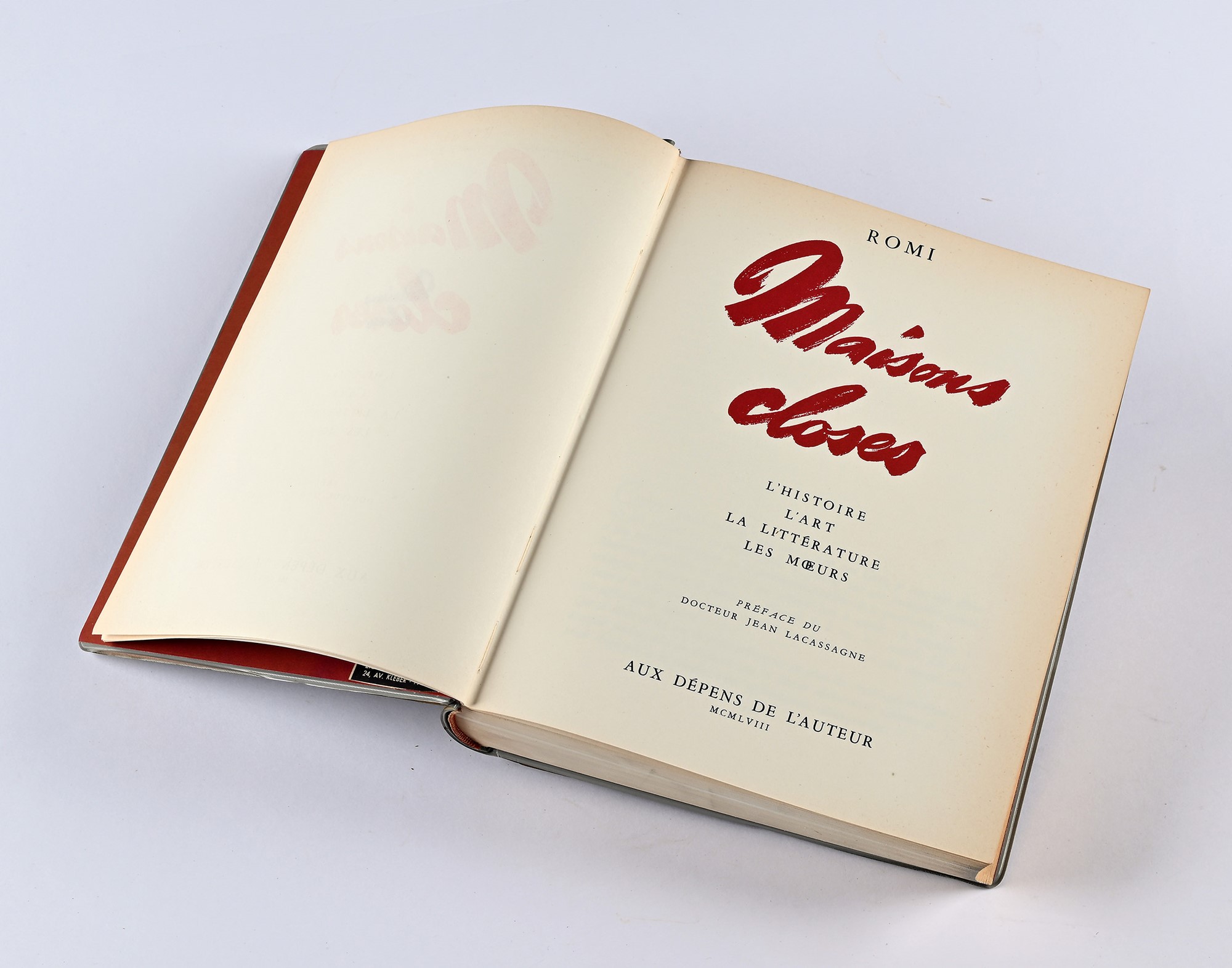 Robert Miquel Romi - Maisons Closes: L'Histoire, L'Art, La Litterature, Les Moeurs Preface du docteur Jean Lacassagne Storia delle "Case Chiuse", dai lupanari romani ai bistrot parigini del '900 attraverso l'arte, la letteratura, i costumi, il cinema, dalle cartoline alla pubblicità dei luoghi di piacere. Tiratura limitata numerata a 1500 esemplari, ns n. 149. Copertina in velour grigio con titoli in rosso al dorso, illustrazioni in b.n. nel testo. Edizione rivista, corretta ed aumentata che costituisce l'edizione definitiva. Aux dépens de l'Auteur, 1958 cm 28x23