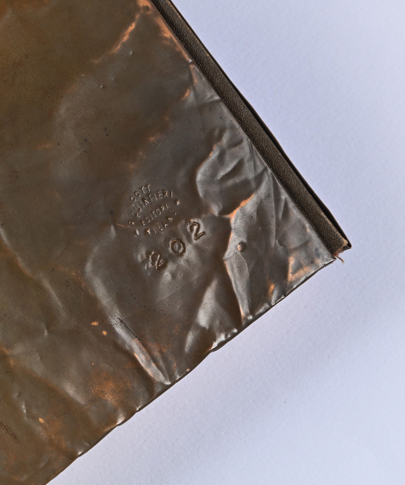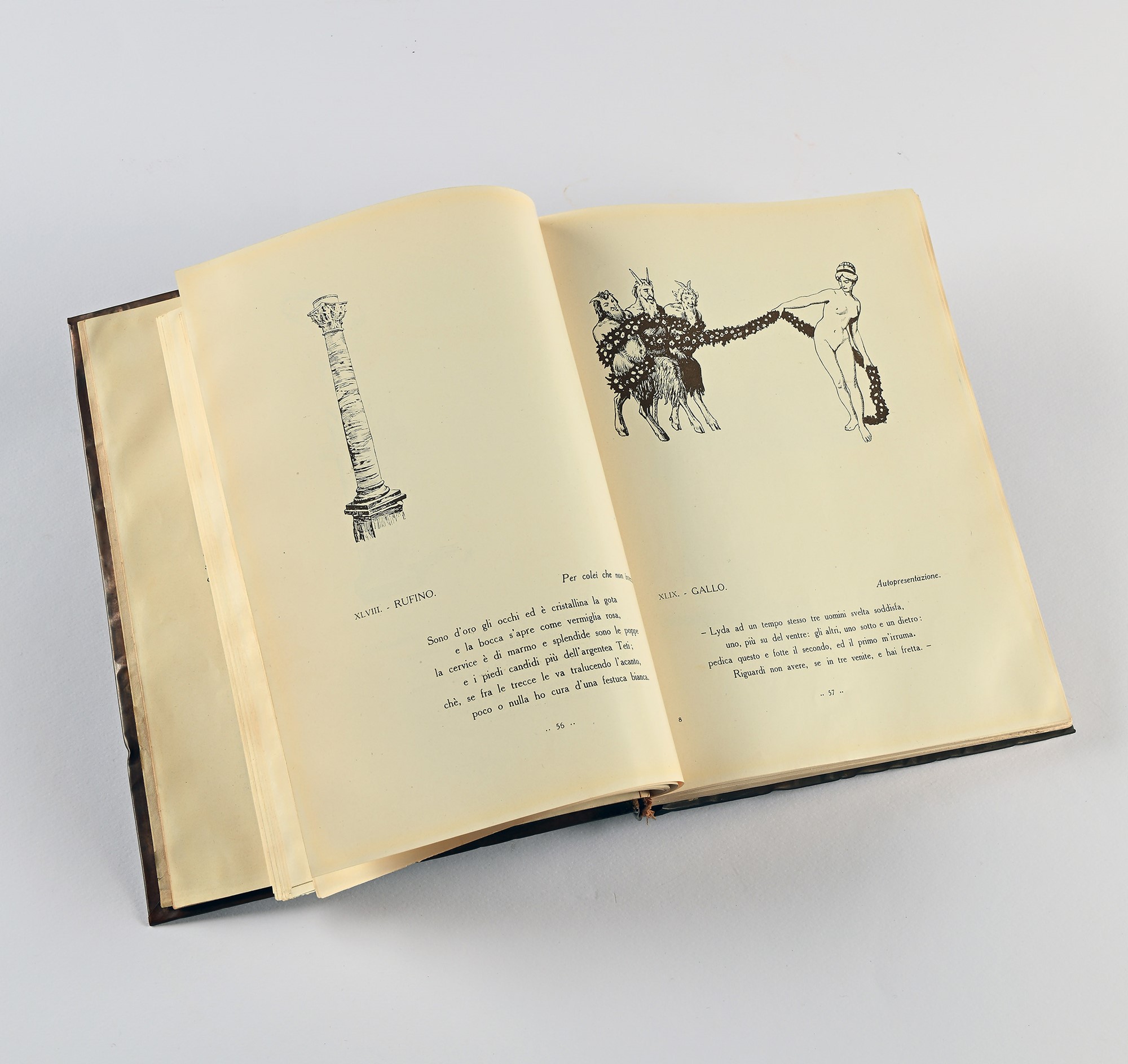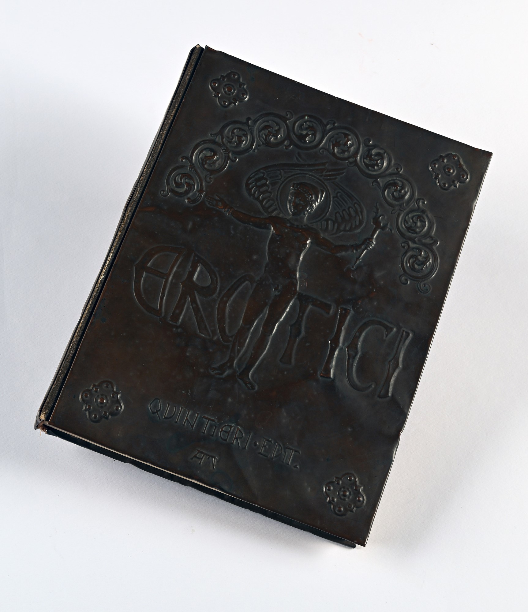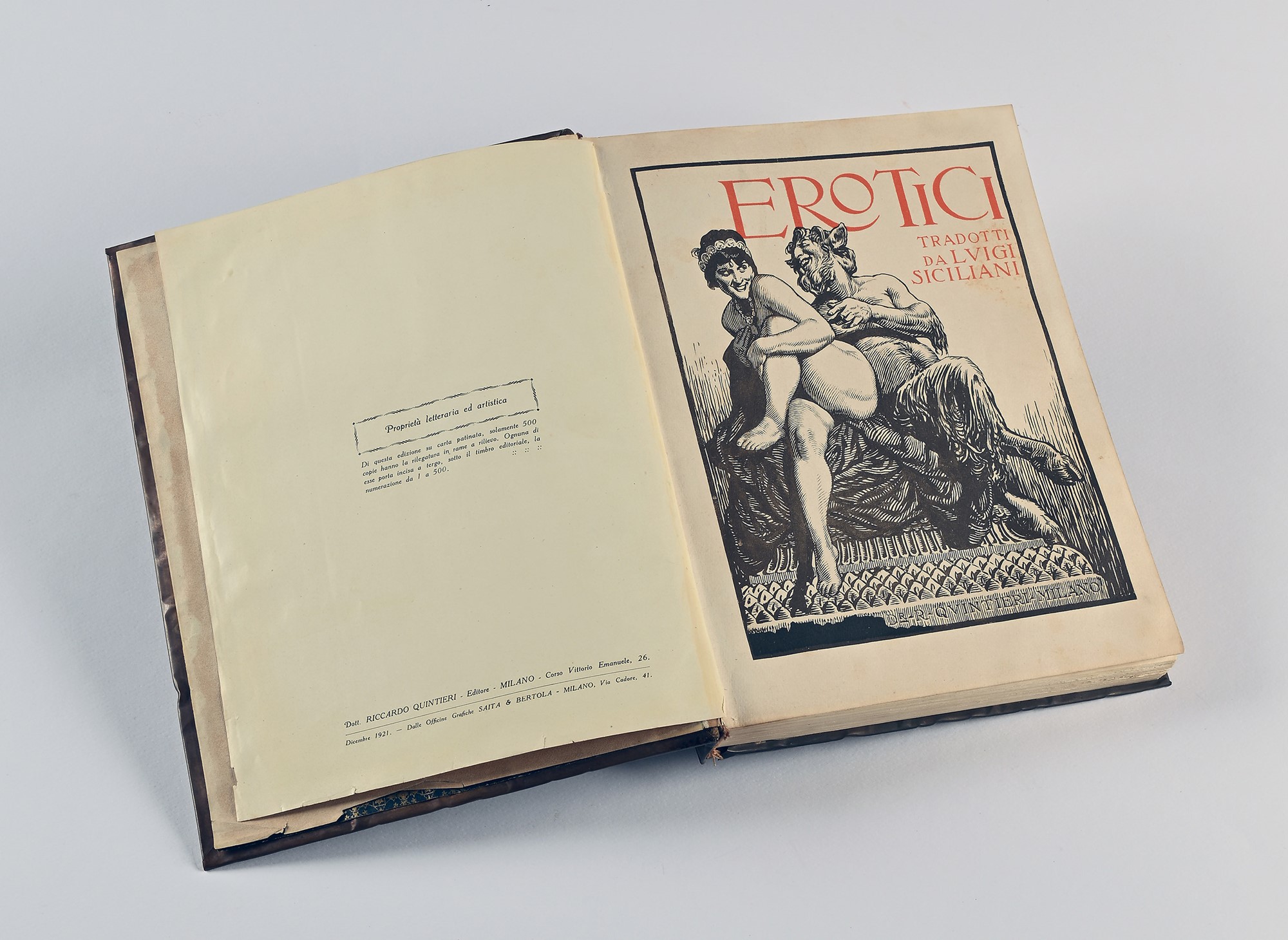 Erotici. Tradotti da Luigi Siciliani In 8°. Volume di pregio. Una delle 500 copie numerate a sbalzo sul rame nella copertina posteriore, stampate su carta patinata con la legatura di lusso ns. esemplare n. 202. Raccolta di versi delle letteratura greca tratti dall'Antologia Palatina, con belle e nitide illustrazioni xilografiche di Adolfo Magrini. Legatura editoriale in rame (piatti e dorso) con titoli e grande illustrazione sbalzata su disegno di Adolfo Magrini al piatto anteriore. Riccardo Quintieri Editore, Milano 1921 cm 25,5x19,5