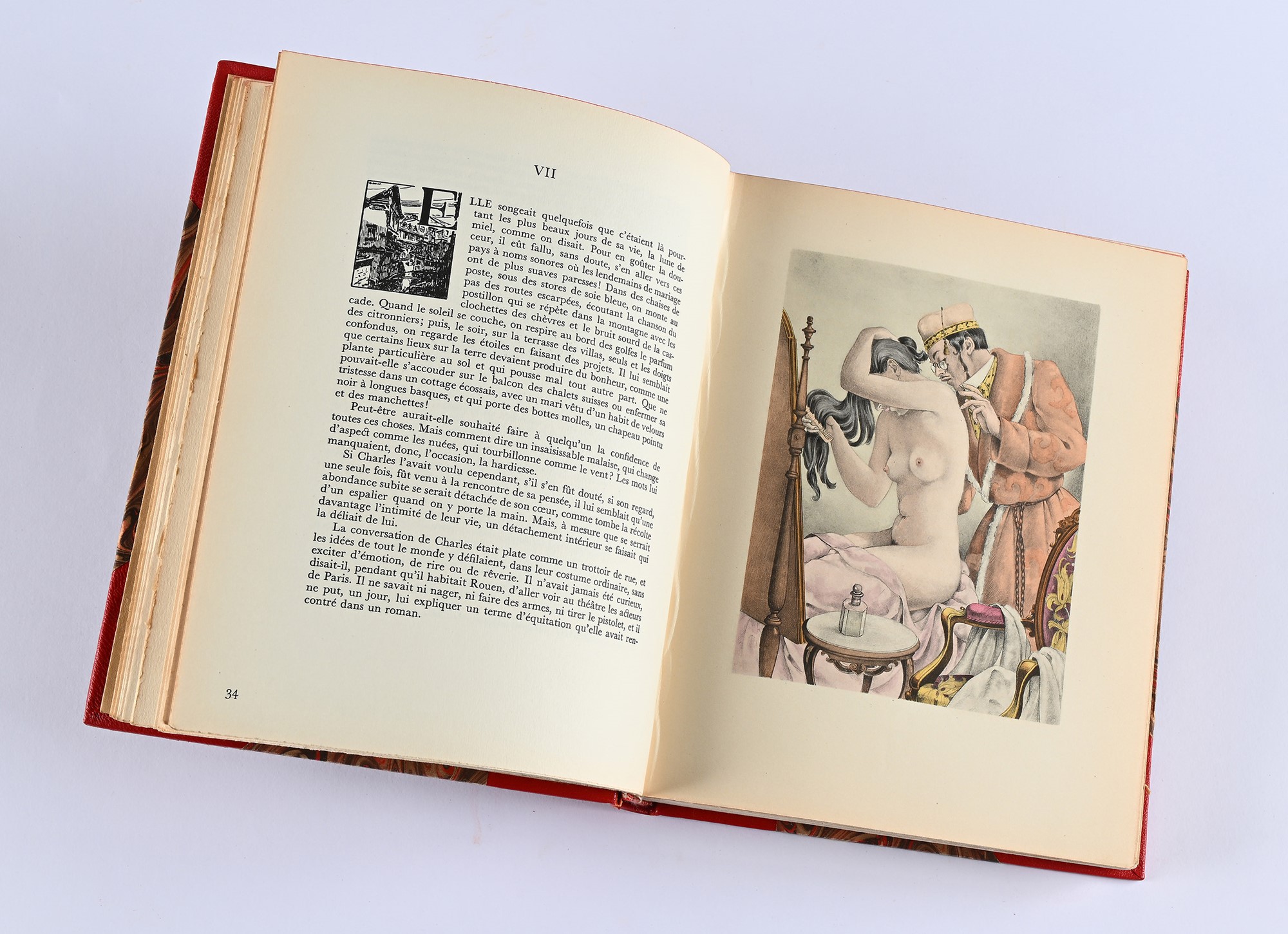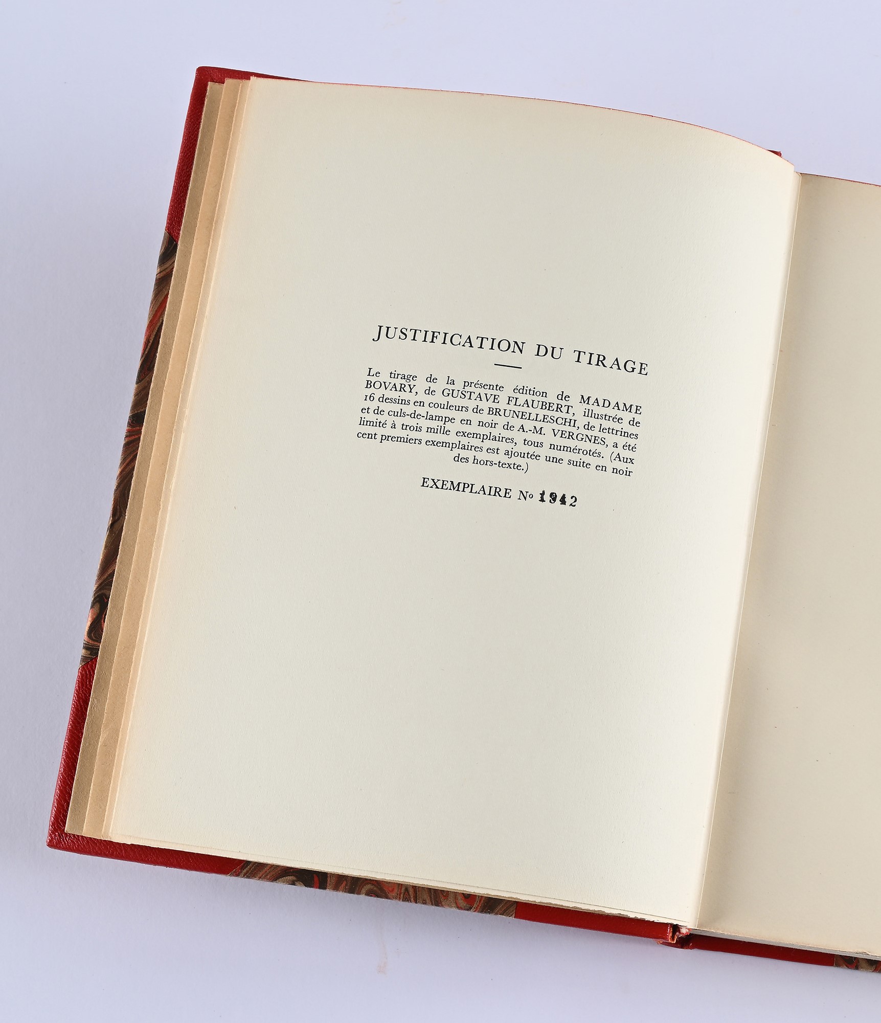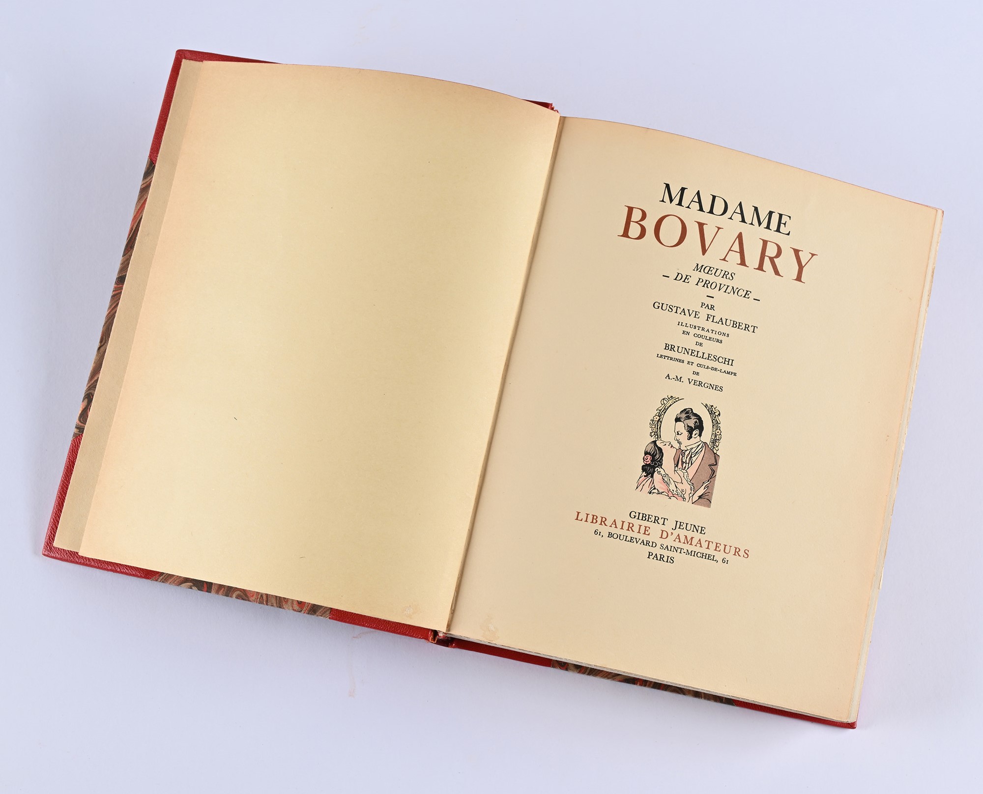 Splendida edizione novecentesca del capolavoro di Flaubert, illustrata con 16 tavole a colori fuori testo di Umberto Brunelleschi e da vignette nel testo di Vergnes. Tiratura limita a 3.000 esemplari su carta velin de condat, ns esemplare 1942. Legatura in mezza pelle moderna a 4 nervi con titoli e fregi in oro al dorso. Conservate le copertine originali illustrate.