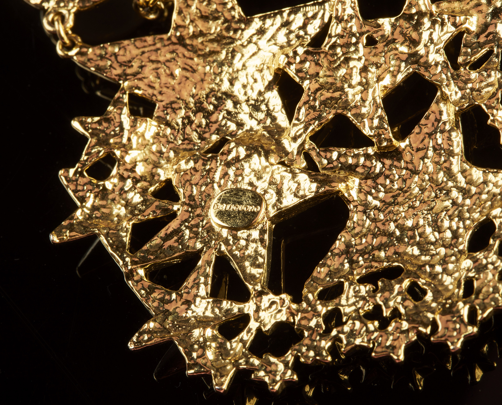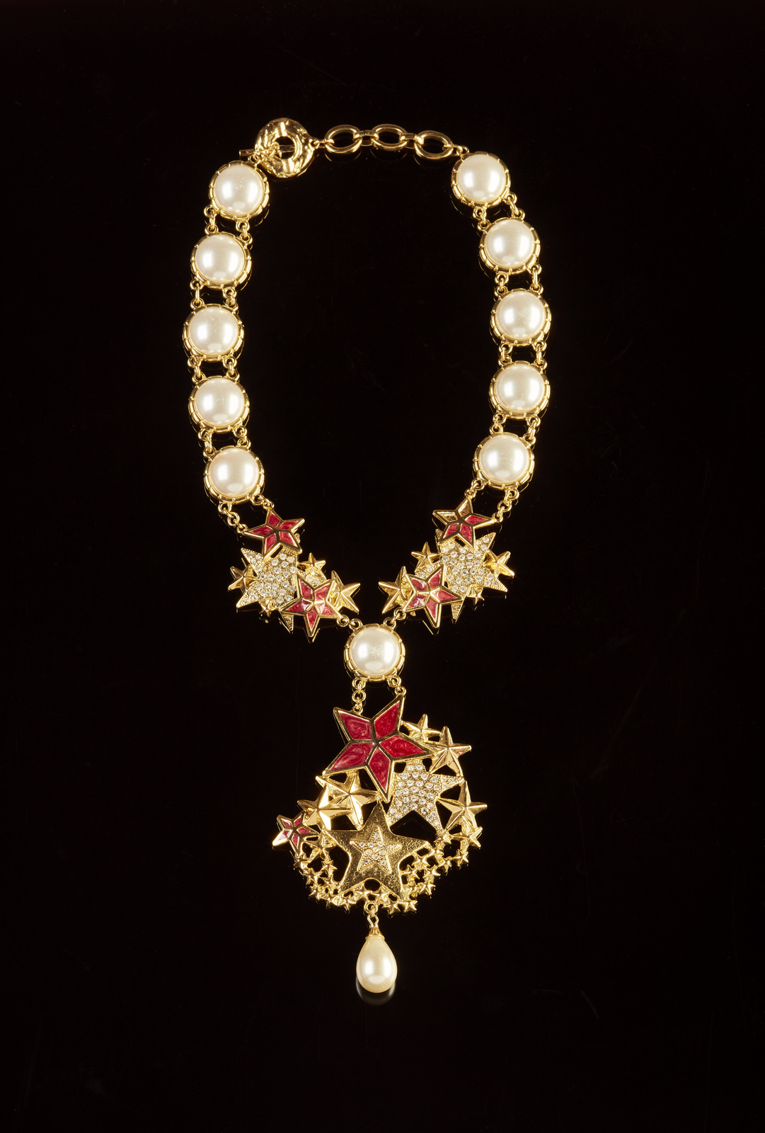 DE LIGUORO GIANNI Collana con perle sintetiche, smalti e strass. Plastica dura. Cm 8,00 x 36,00. Collana con perle sintetiche, decorazioni di stelle a smalto color cordeaux e strass.