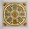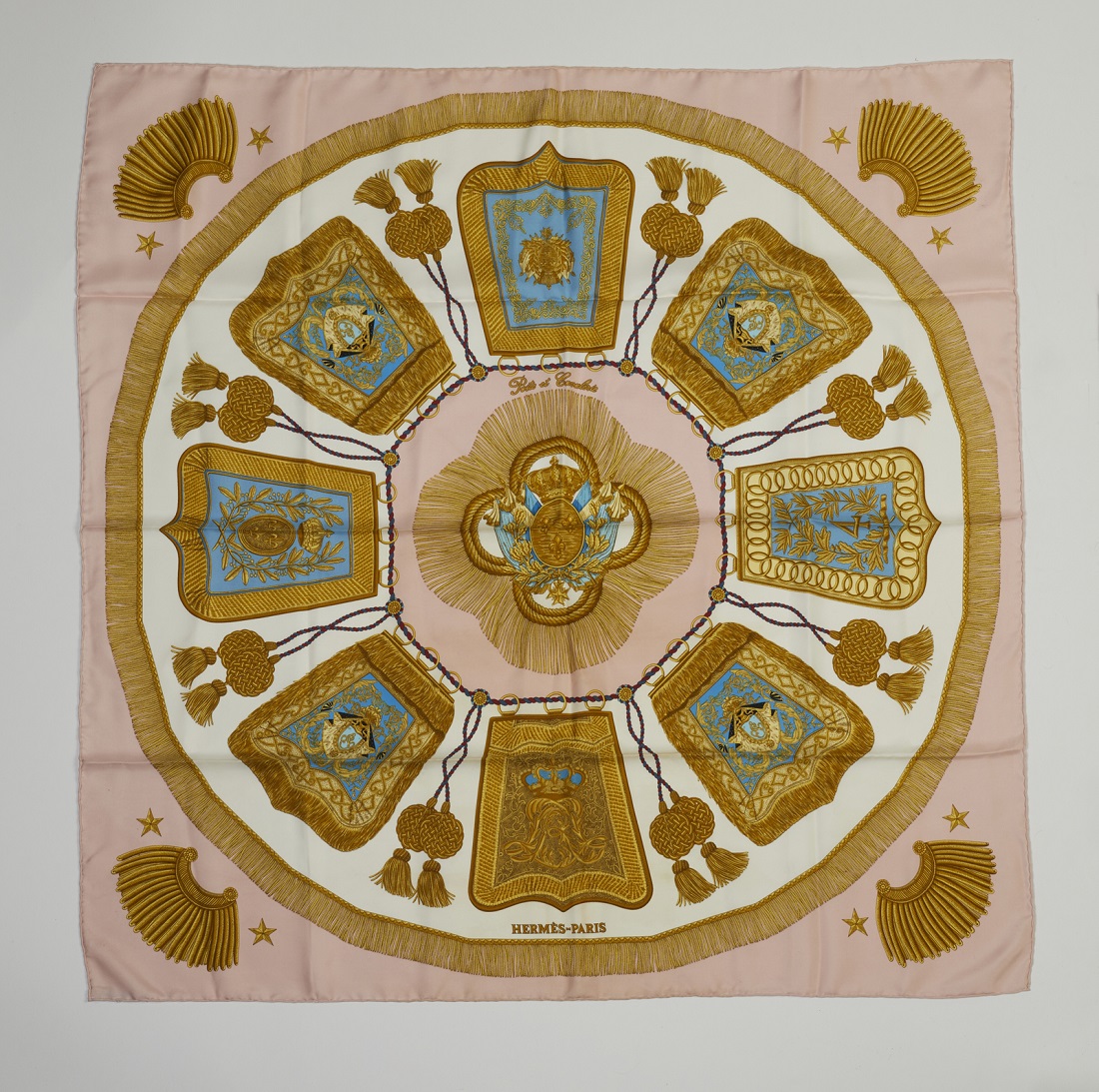 HERMES Foulard "Poste et Cavalerie". Seta. Cm 90,00 x 90,00. Foulard Hermès vintage , carré in seta, orli profilati a mano, sfondo bianco e bordi rosa antico, fantasia stampata con disegno di galloni, stemmi e mostrine nei toni prevalenti del giallo e dell'azzurro, collezione "Poste et Cavalerie", disegnata nel 1986 da Joachim Metz. Eccellenti condizioni.