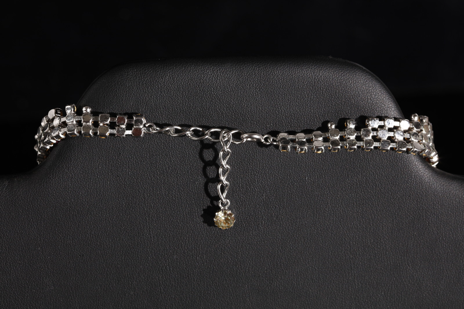 AUTORE NON IDENTIFICATO Collana e orecchini. Pietre dure. . Parure composta da una collana ed un paio di orecchini a clip in strass. Dimensioni orecchini: 4 cm altezza, collana 21 cm altezza. Scatola non originale.