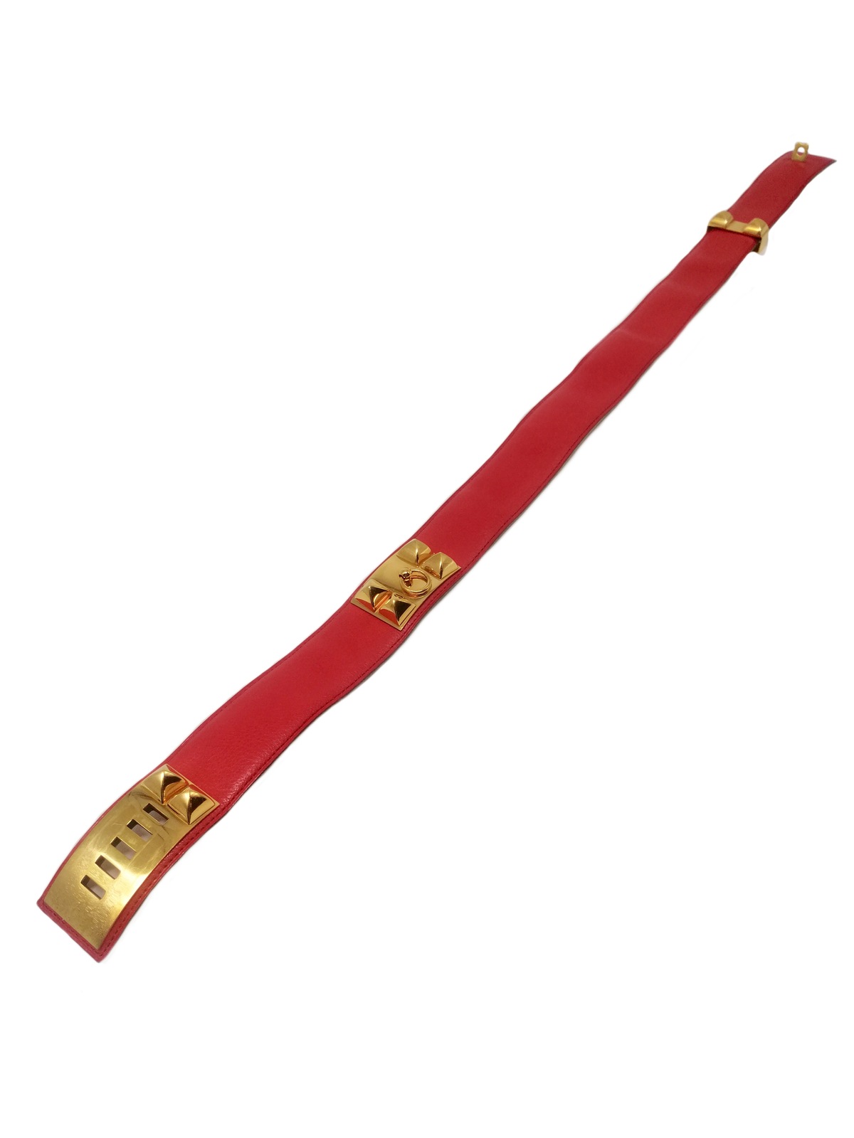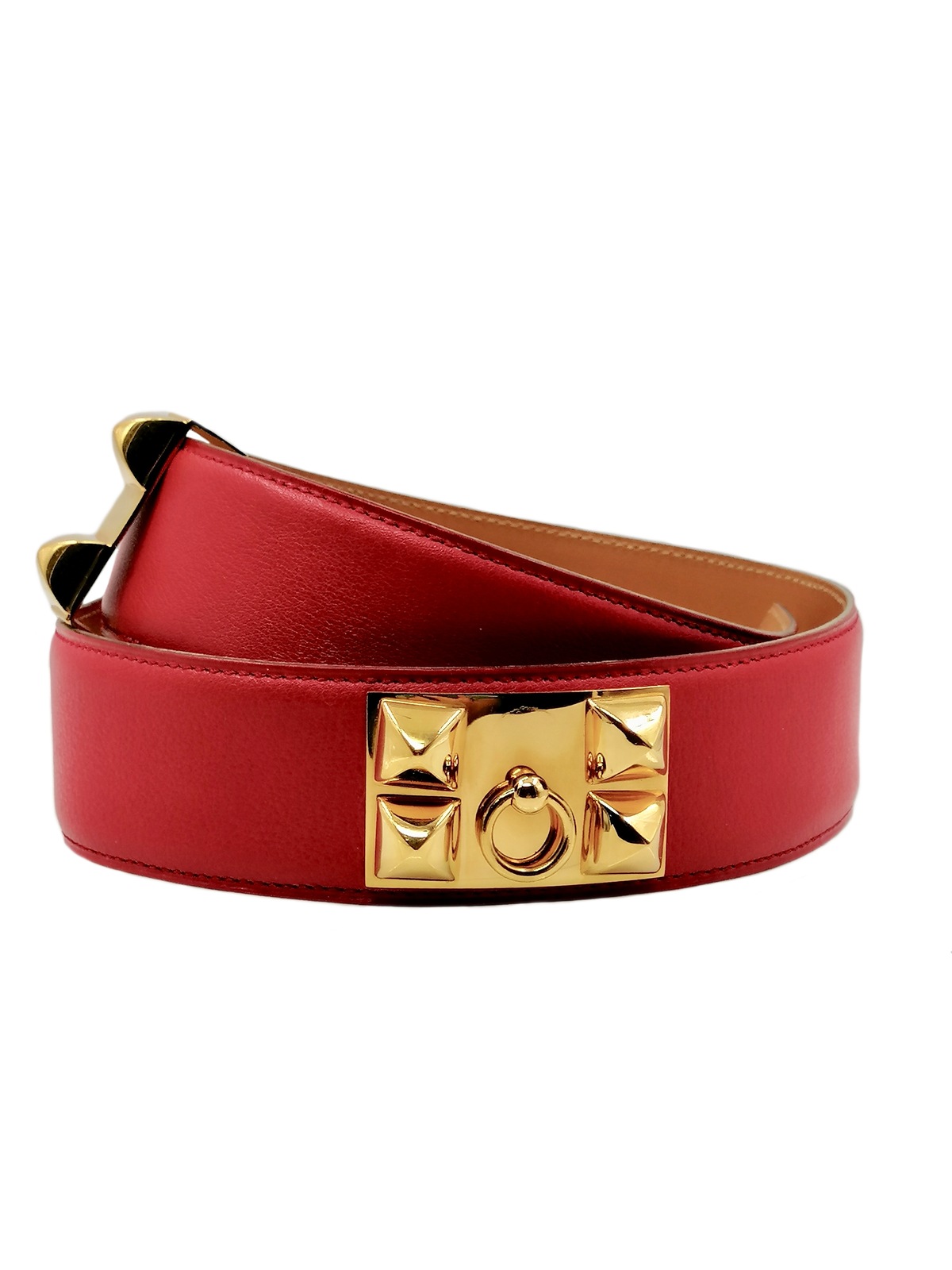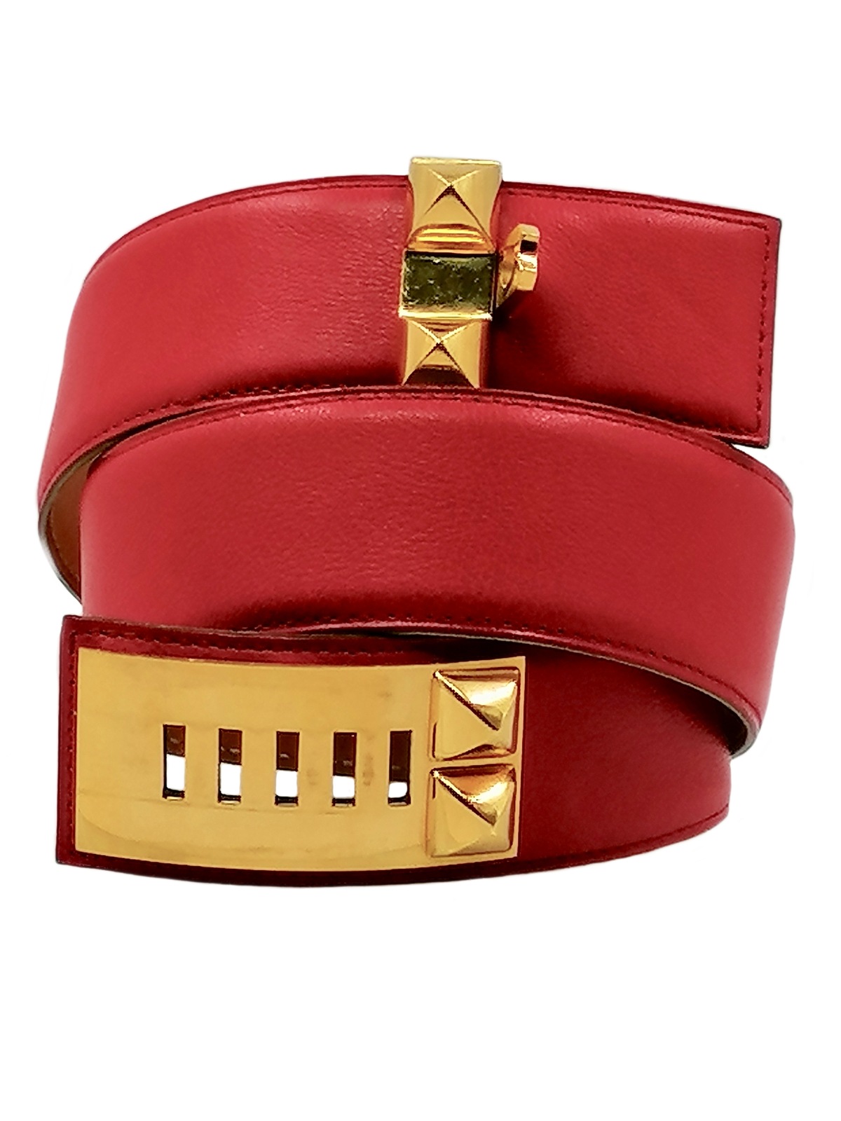 HERMES Cintura COLLIER DE CHIEN. 1996. Metallo e pelle. Cm 72,00 x 4,00. Cintura in pelle rossa, interno in cuoio chiaro, metalleria dorata. Anno 1996 - Z - 96 nel cerchio all'interno.