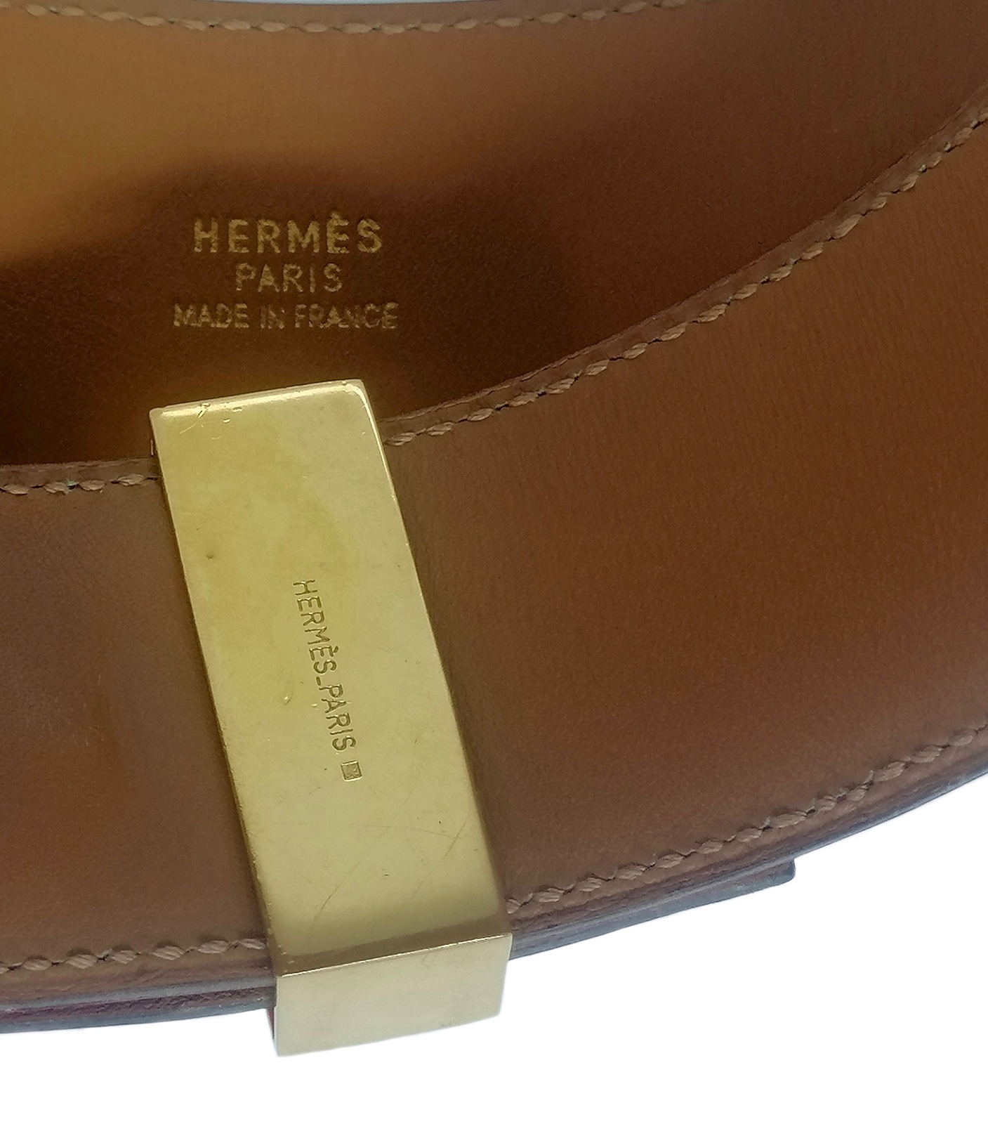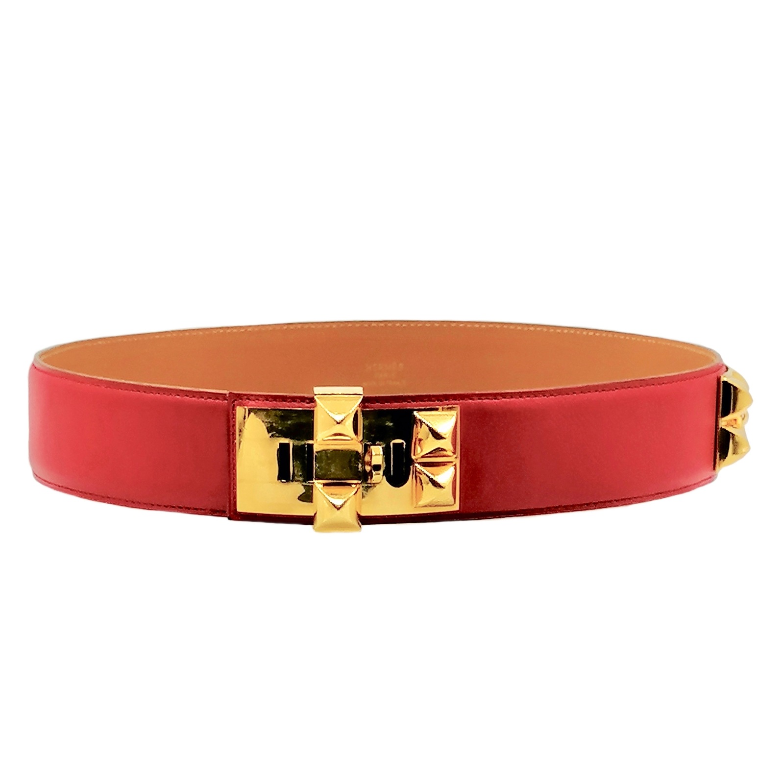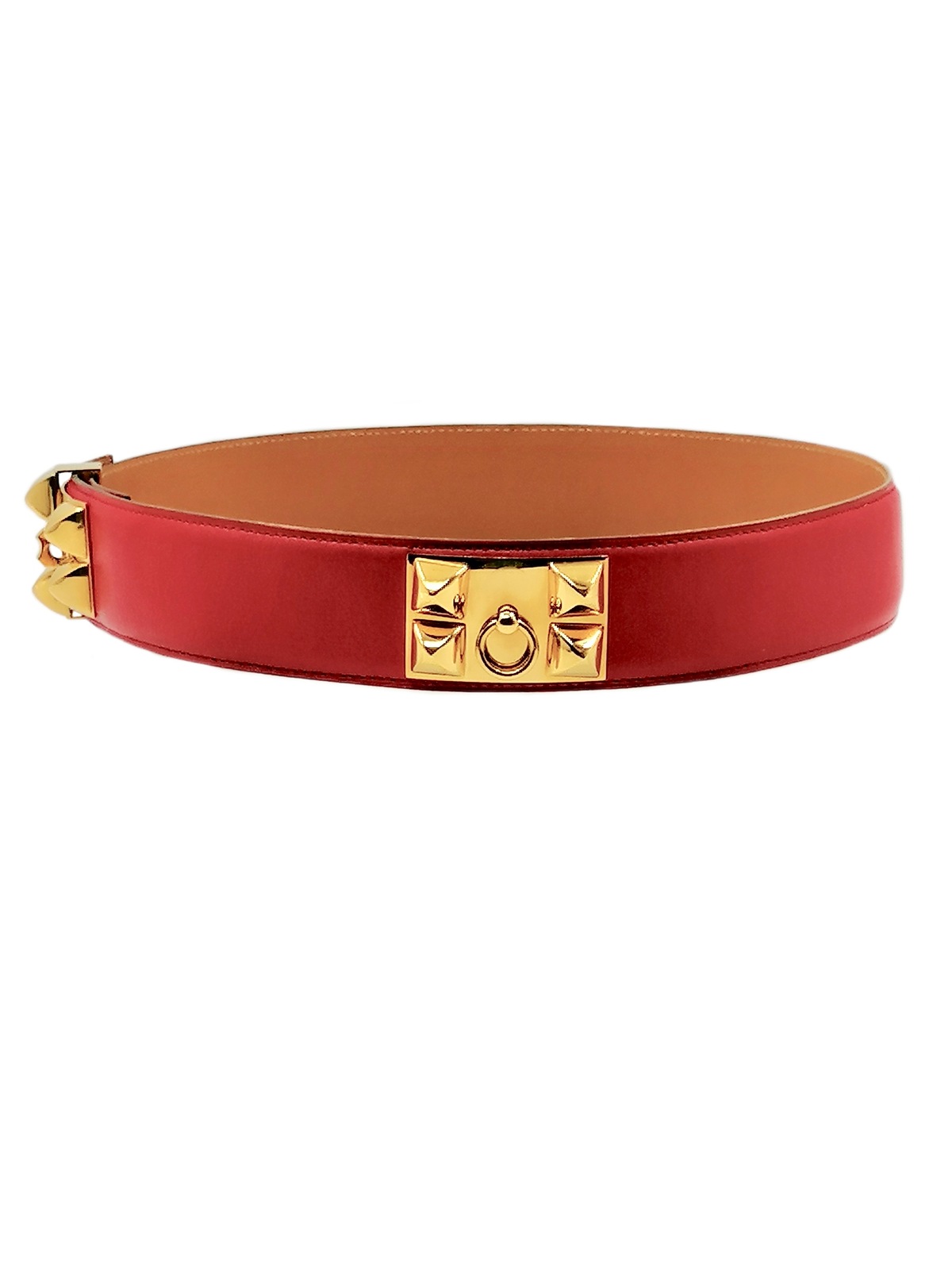 HERMES Cintura COLLIER DE CHIEN. 1996. Metallo e pelle. Cm 72,00 x 4,00. Cintura in pelle rossa, interno in cuoio chiaro, metalleria dorata. Anno 1996 - Z - 96 nel cerchio all'interno.