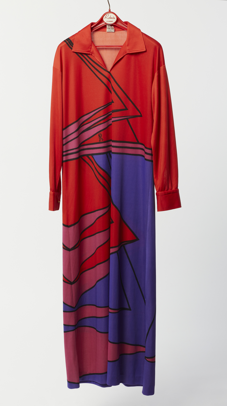 DI CAMERINO ROBERTA Abito fantasia rosso e blu. Jersey. . Abito lungo in jersey Roberta di Camerino, stampa a fantasia geometrica nei toni del rosso, rosa antico, azzurro, scollo con colletto aperto, maniche lunghe, etichetta presente.