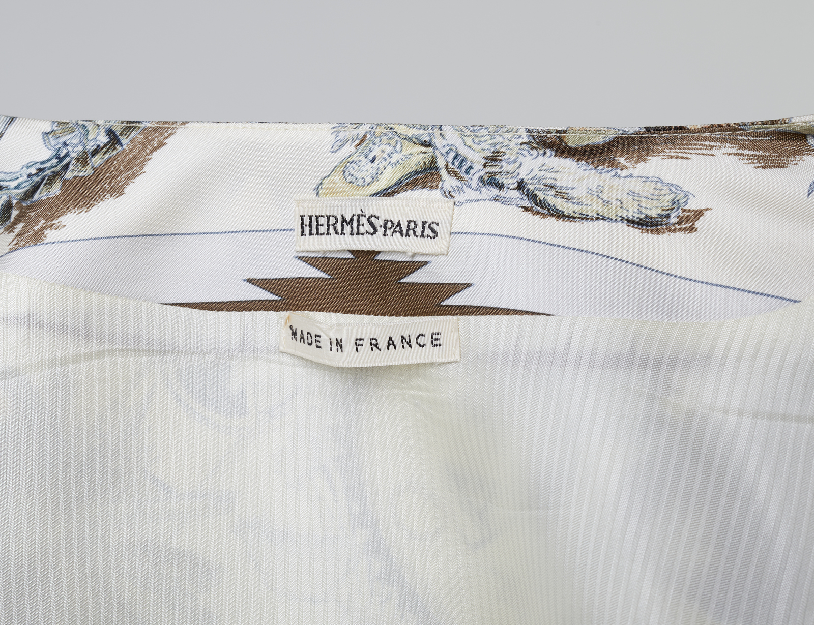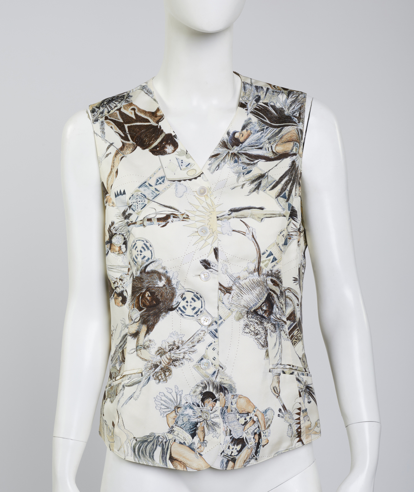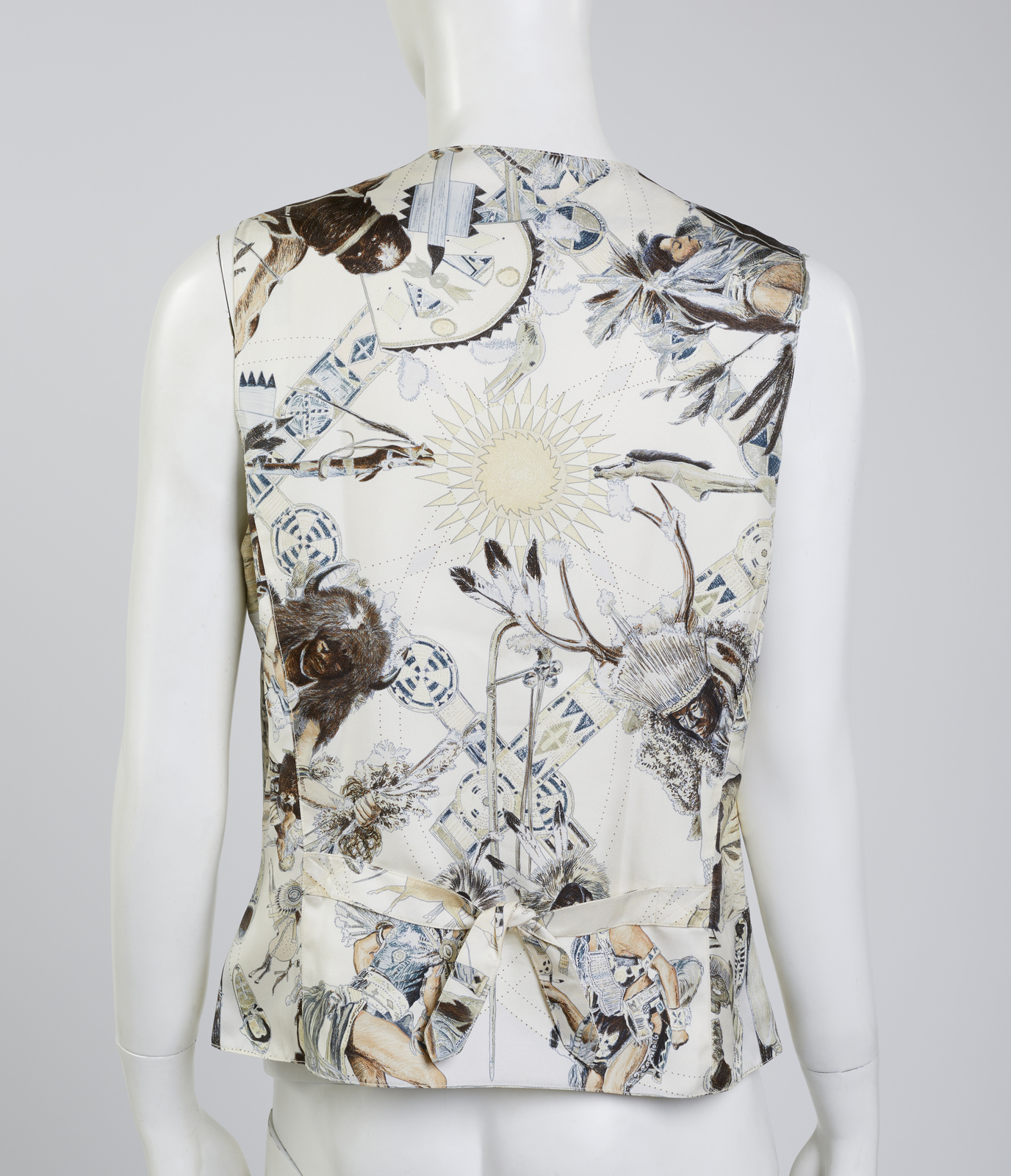 HERMES Gilet in seta "Les Danses des Indiens". 1999. Seta. Cm 44,00. Gilet Hermès in 100% seta, made in France, stampata con motivo"Les Danses des Indiens", realizzato da Kermit Oliver dal 1999, nei toni prevalenti del bianco, beige, grigio e nero. Spalla 34 cm , vita 44 cm.