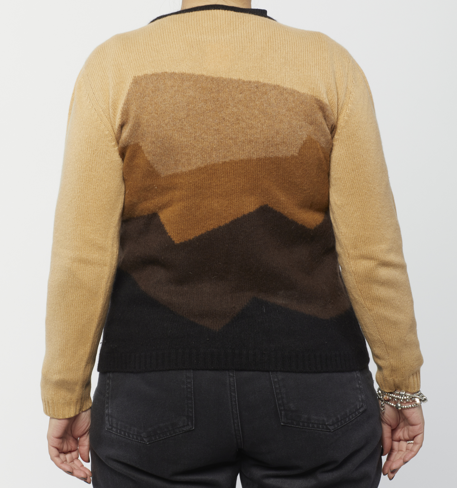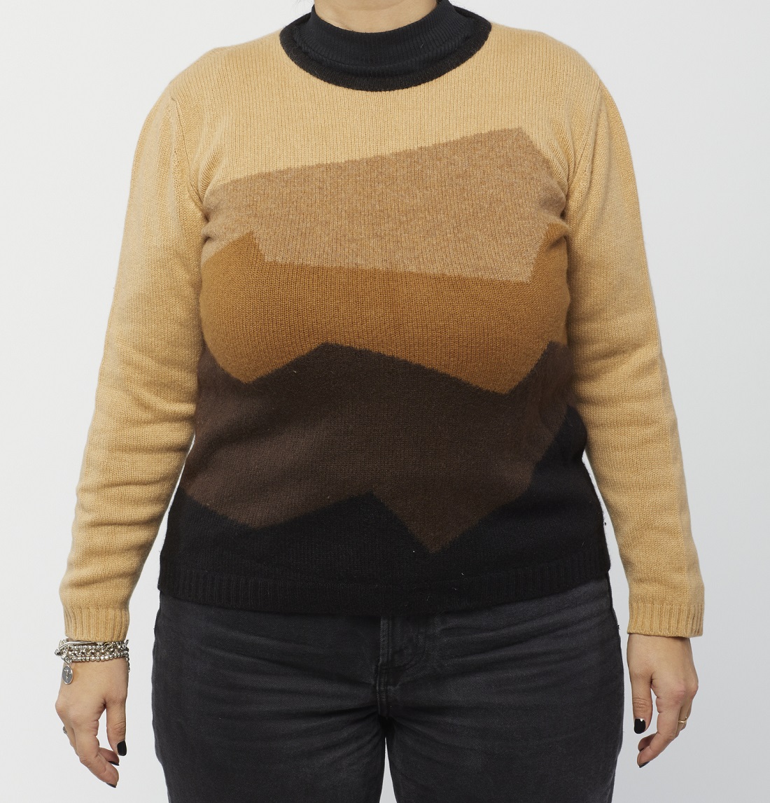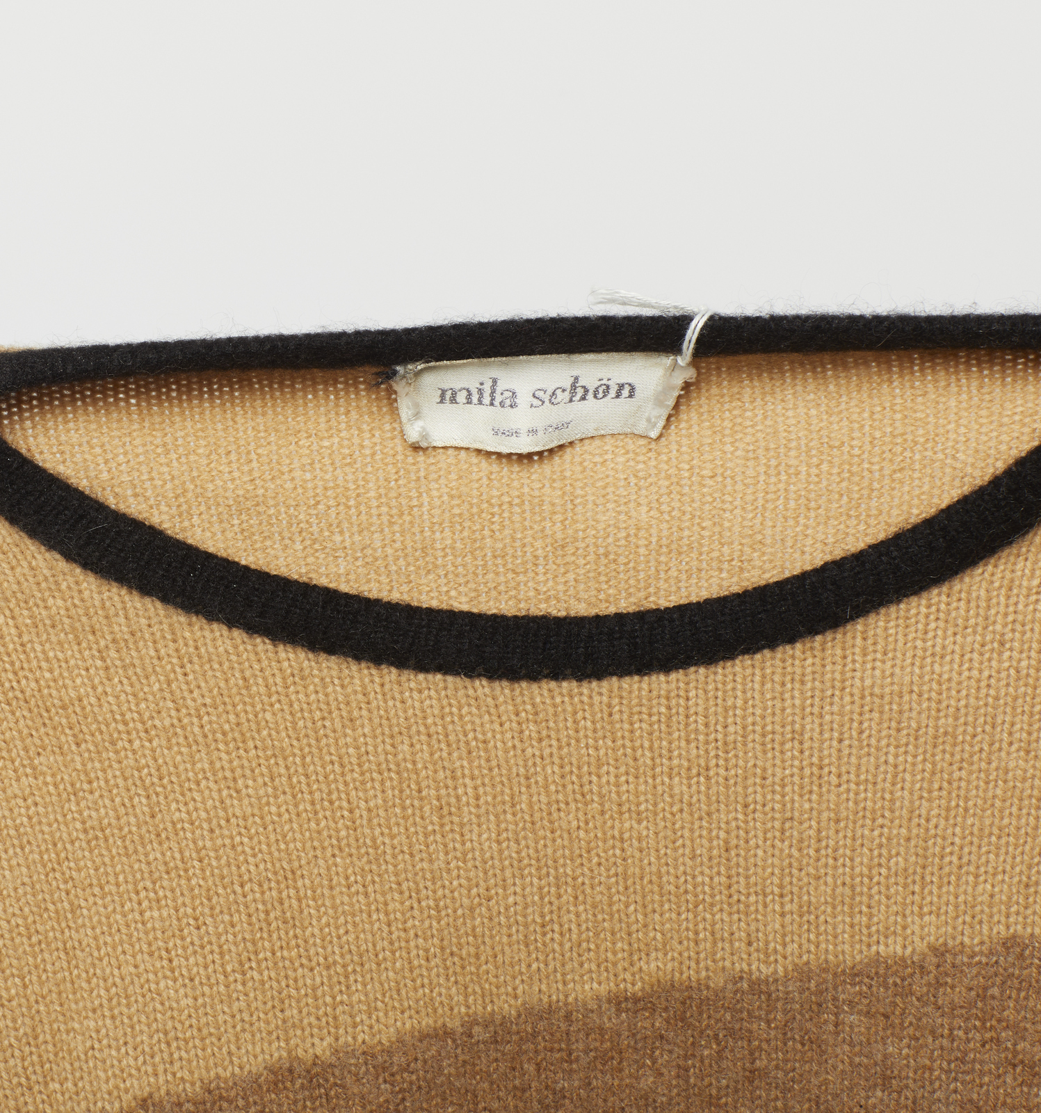 SCHON MILA Maglioncino in cashmere beige con motivo geometrico degradé. cashmere. . Maglioncino Mila Schon vintage, collo rotondo, in cashmere 100% beige con decorazione a motivo geometrico degradé nei toni del marrone e nero. Etichetta presente. Tg. 42 indicativa.